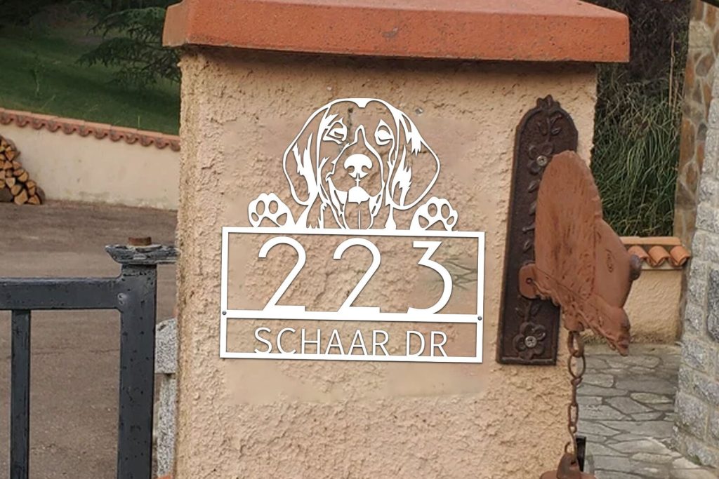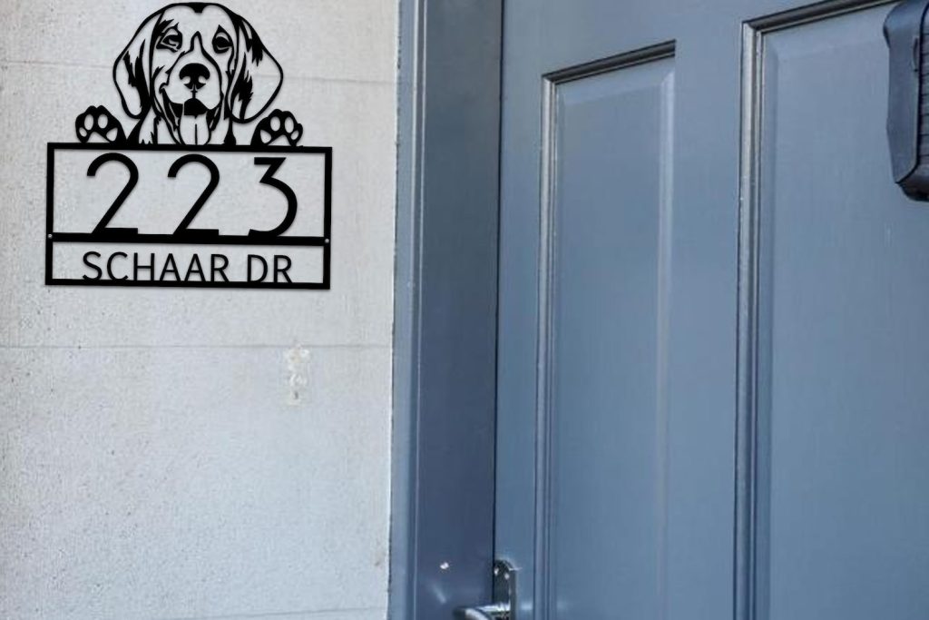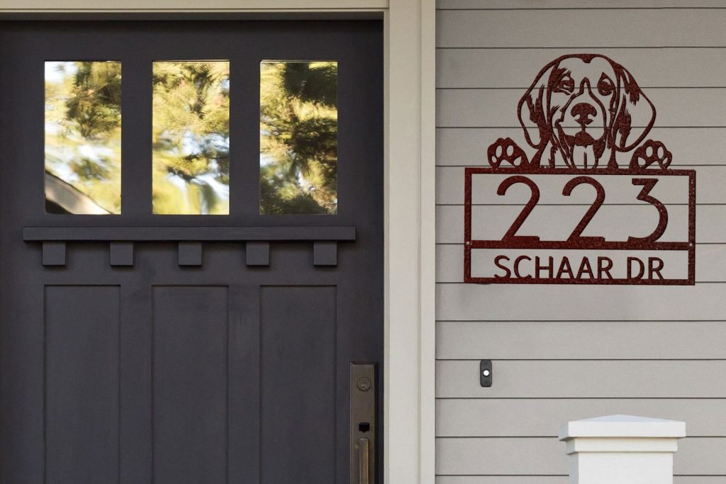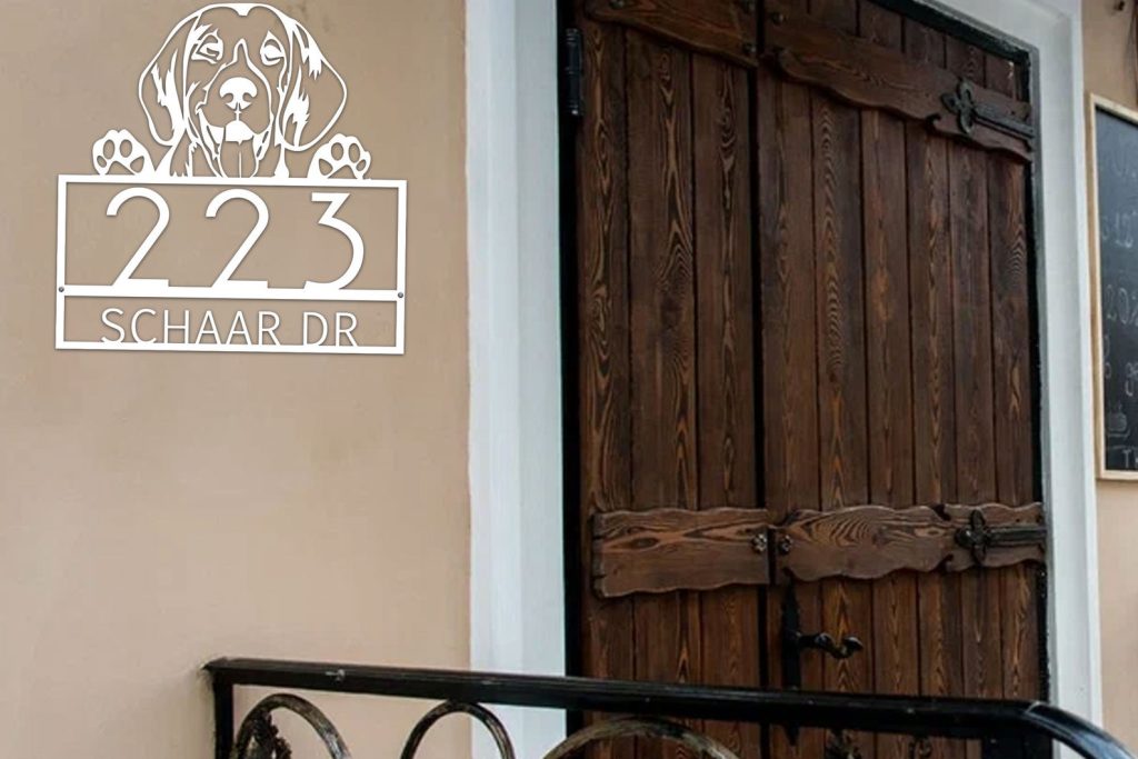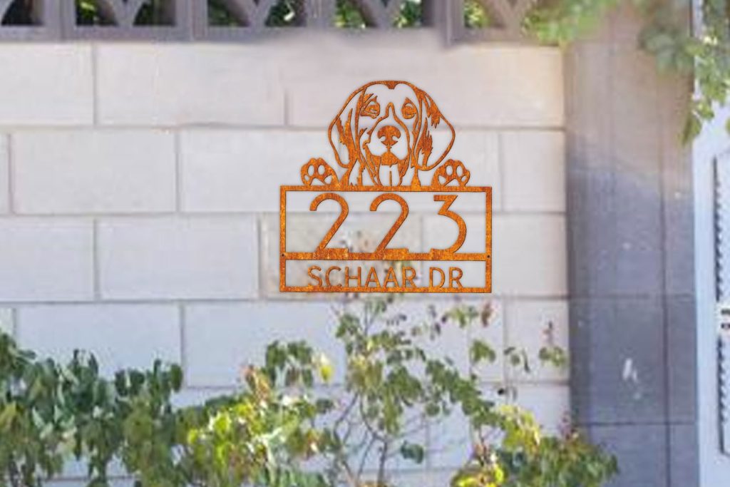 Horizontal Dog Silhouette Address Sign. Made with 14 gauge American made steel and powder coat to help prevent rust and discoloration. Made from high-quality metal, our custom address sign is durable and weather-resistant, ensuring that it will last for years to come. The sign can be customized with your address or any other text that you choose, making it a truly unique and personalized addition to your property. It can be used as a family property to last for generations.