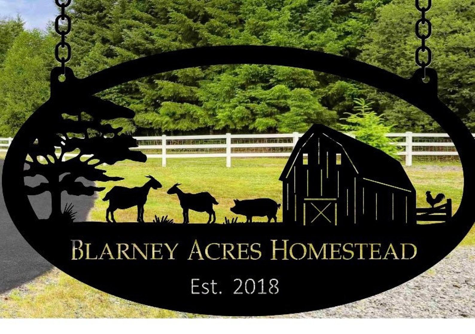 Rustic, personalized metal sign with farm scene . Measures 3 ftx 20". Powder coated black or beautiful copper acid and clear coated. LEAVE NOTE TO SELLER WITH NAME AND OR EST. DATE YOU WANT ON SIGN. PROOF PROVIDED NOTE! If you order brushed metal, it will rust within a short time since theres no UV block, unlike black which is a solid finish