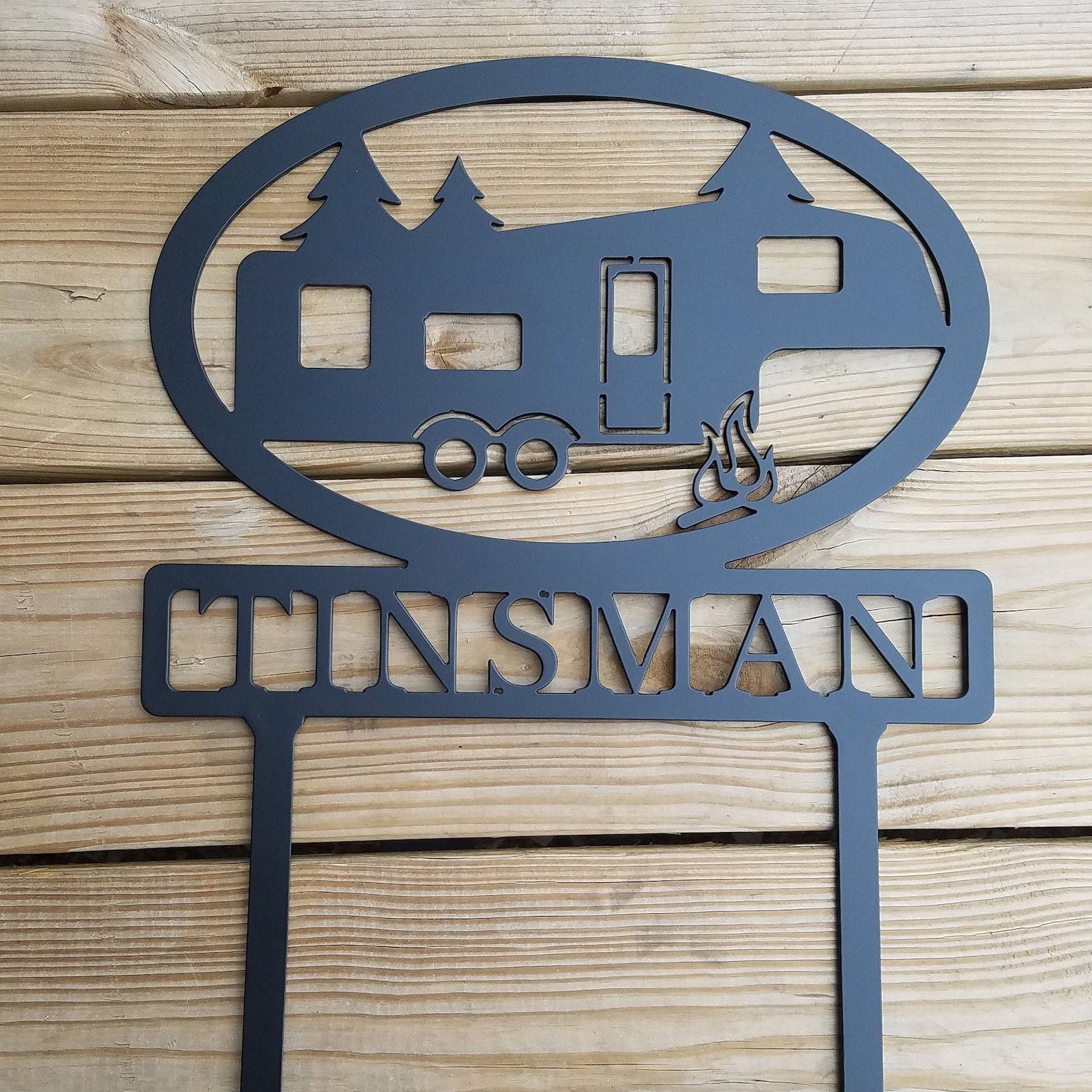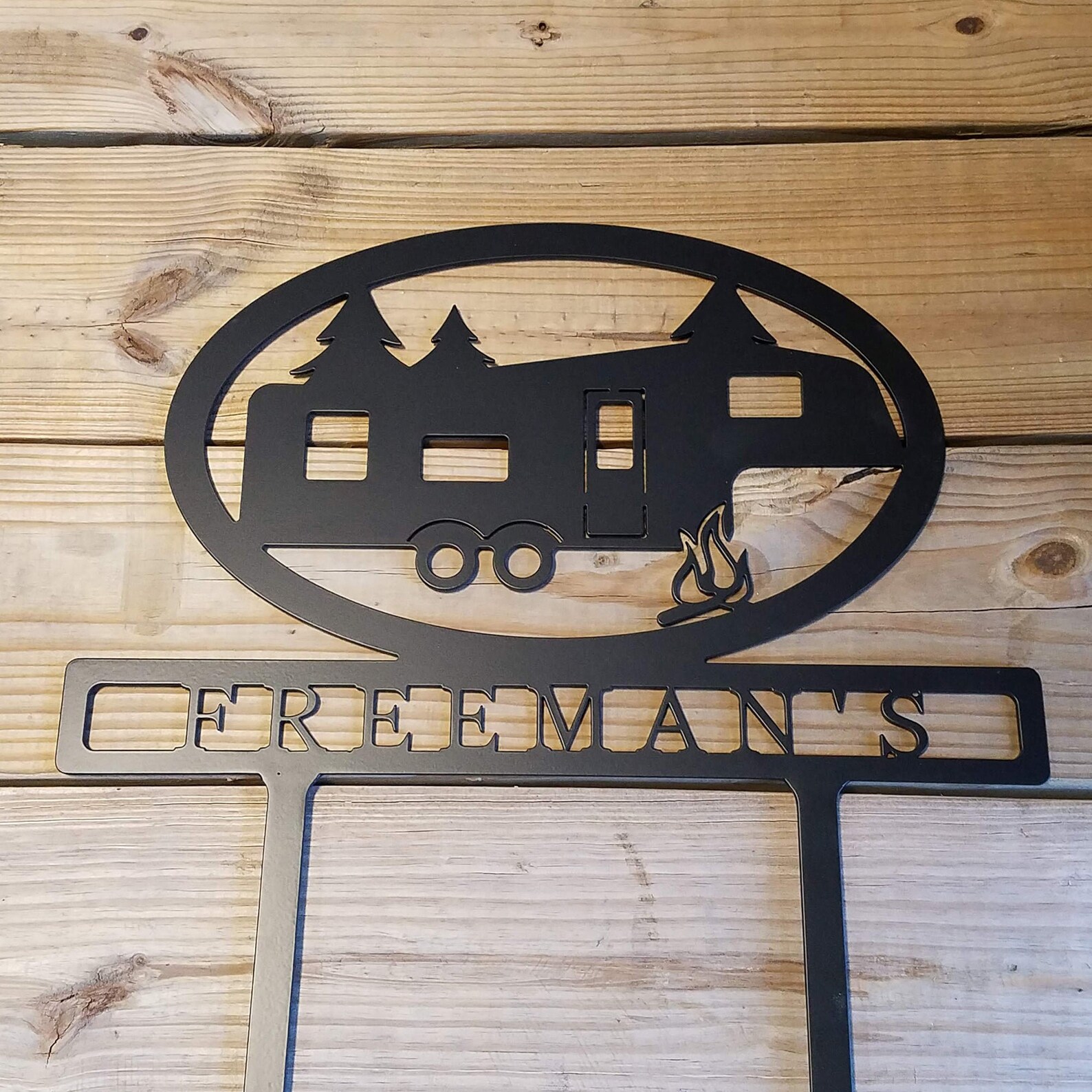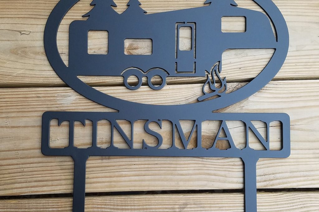 Campers…this is for you! Customize your own camper sign. This metal "5th Wheel" camper sign is the perfect sign for your camping trip or for a friend who loves to camp. Push by hand or pound into the ground with a rubber mallet. Made using super-durable 11 gauge steel and powder coated black.Add a personal touch by adding your, or your favorite camper9;s name.