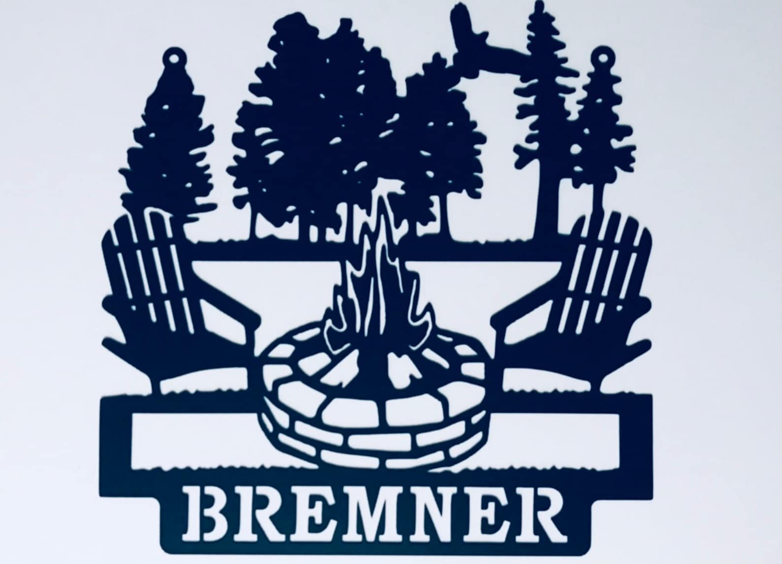 Firepit with trees & an eagle personalized custom sign for inside or outside use. Great for home, cabin, campground and often bought as a gift. 16 gauge steel, powder coated black. Can be hung flat on a wall or from chain. Signs are individually made, not mass produced. I9;ve made them with Family Name, The with Family Name, Campground Lot with #, two first names example Mark & Christine