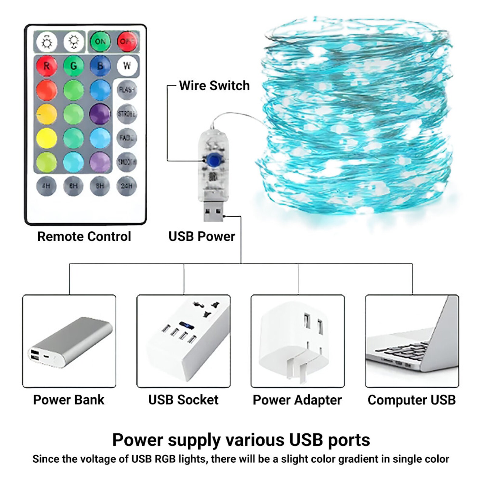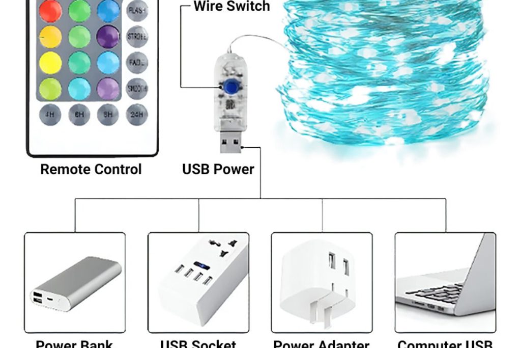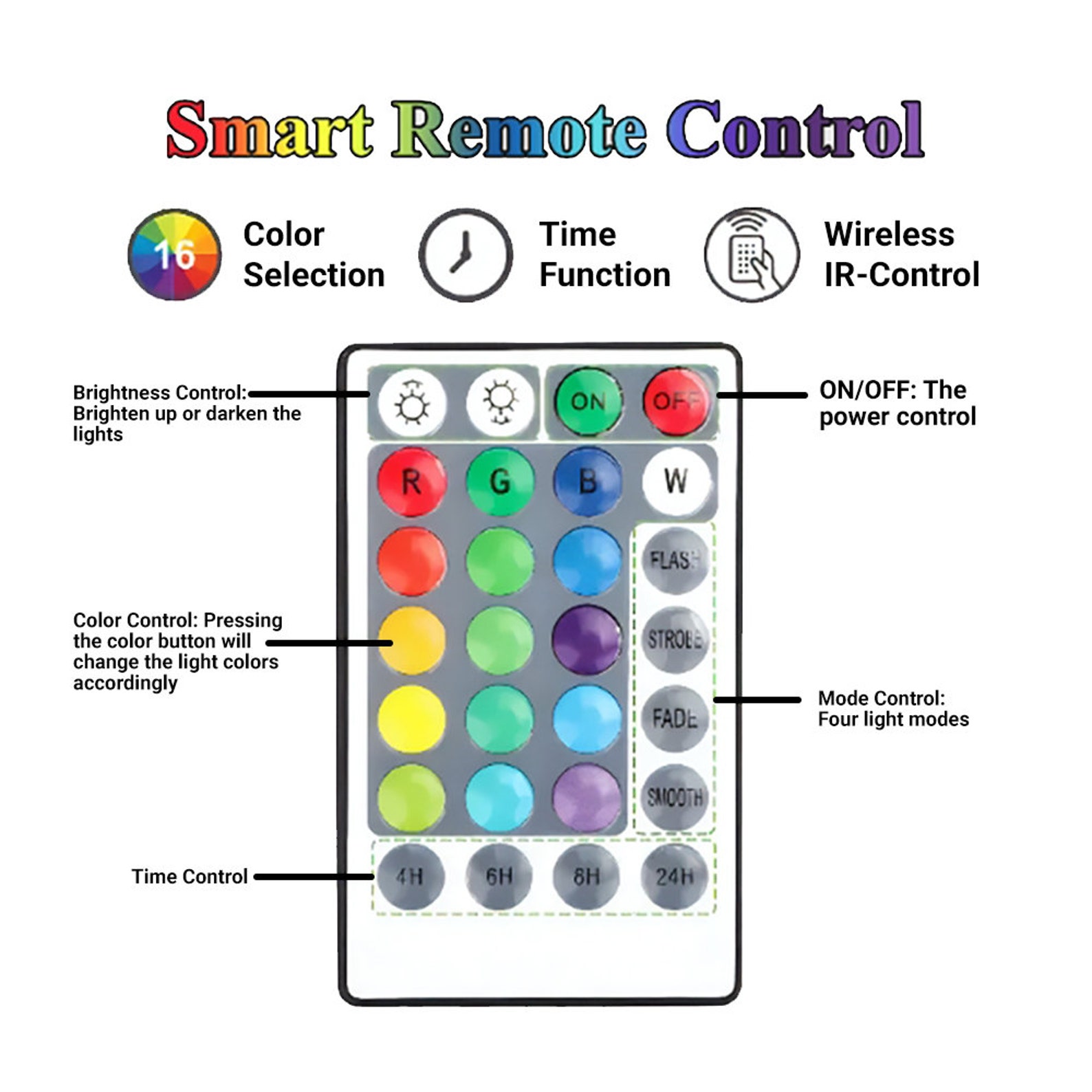– Remote control: Allows you to easily control the lights, on and off, select from 16 vivid colors, modify the brightness, cycle through various colors, and set a timer.