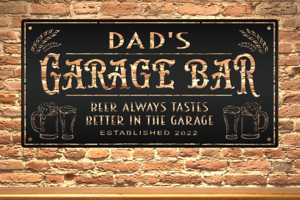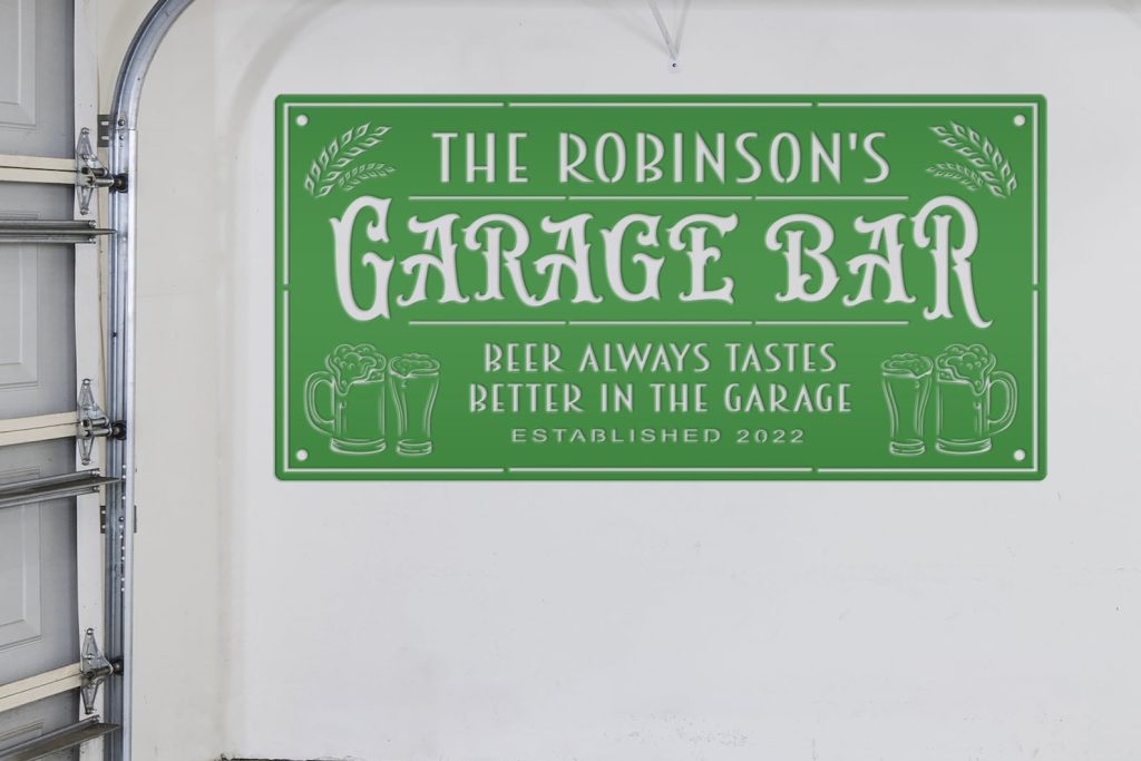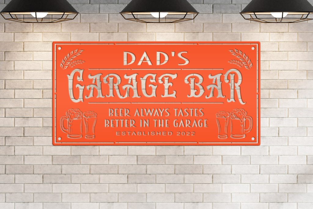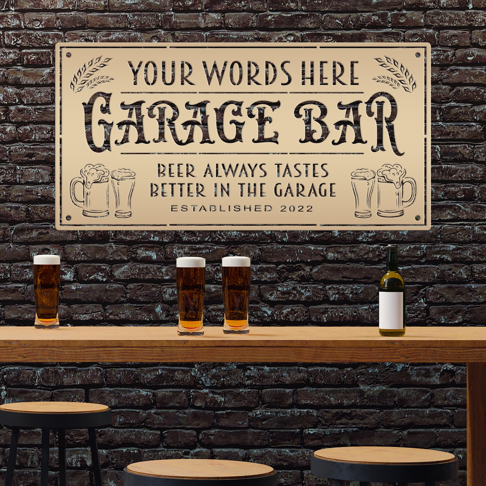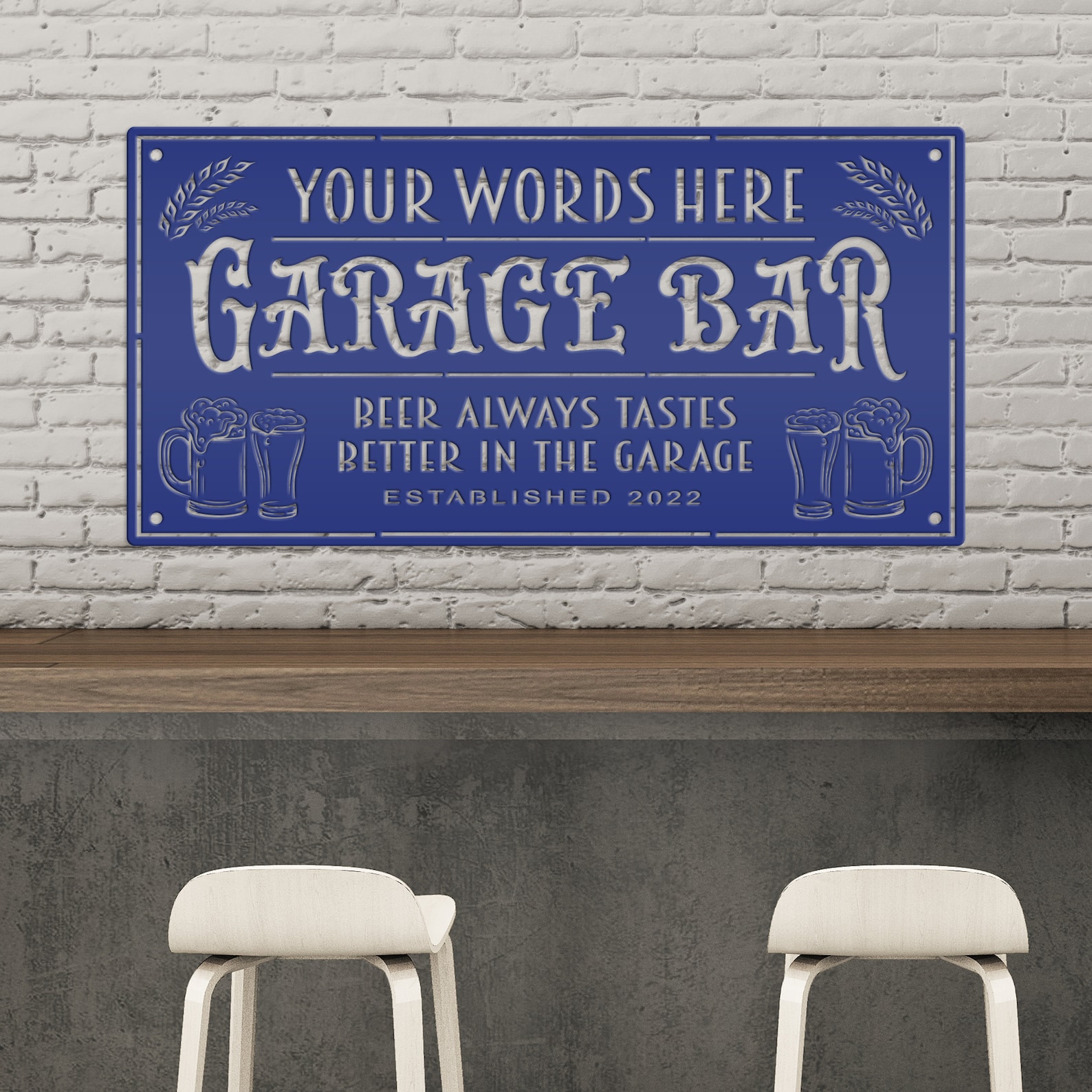 This custom garage bar sign is perfect for any man cave or garage. The personalized metal garage sign features a rectangle design with your own custom wording. It9;s the perfect addition to any home bar, shop, man cave, and makes a great gift for Father9;s Day or any other special occasion. Hang it on the wall or use it as a door hanger to show off your favorite beer drinking hole.