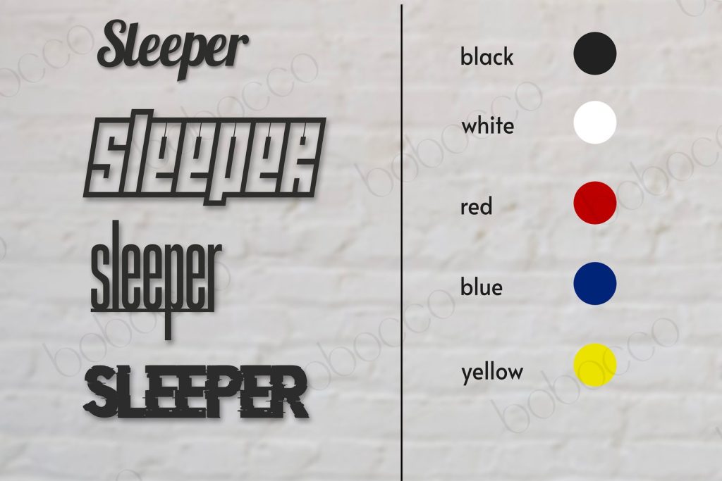 Handmade using laser cut technology, this Metal Sleeper Sign comes in five different sizes (10in, 16in, 28in, 39in, and 55in) and five different colors (black, white, red, blue, and yellow). It can be shipped for free and is currently on sale.