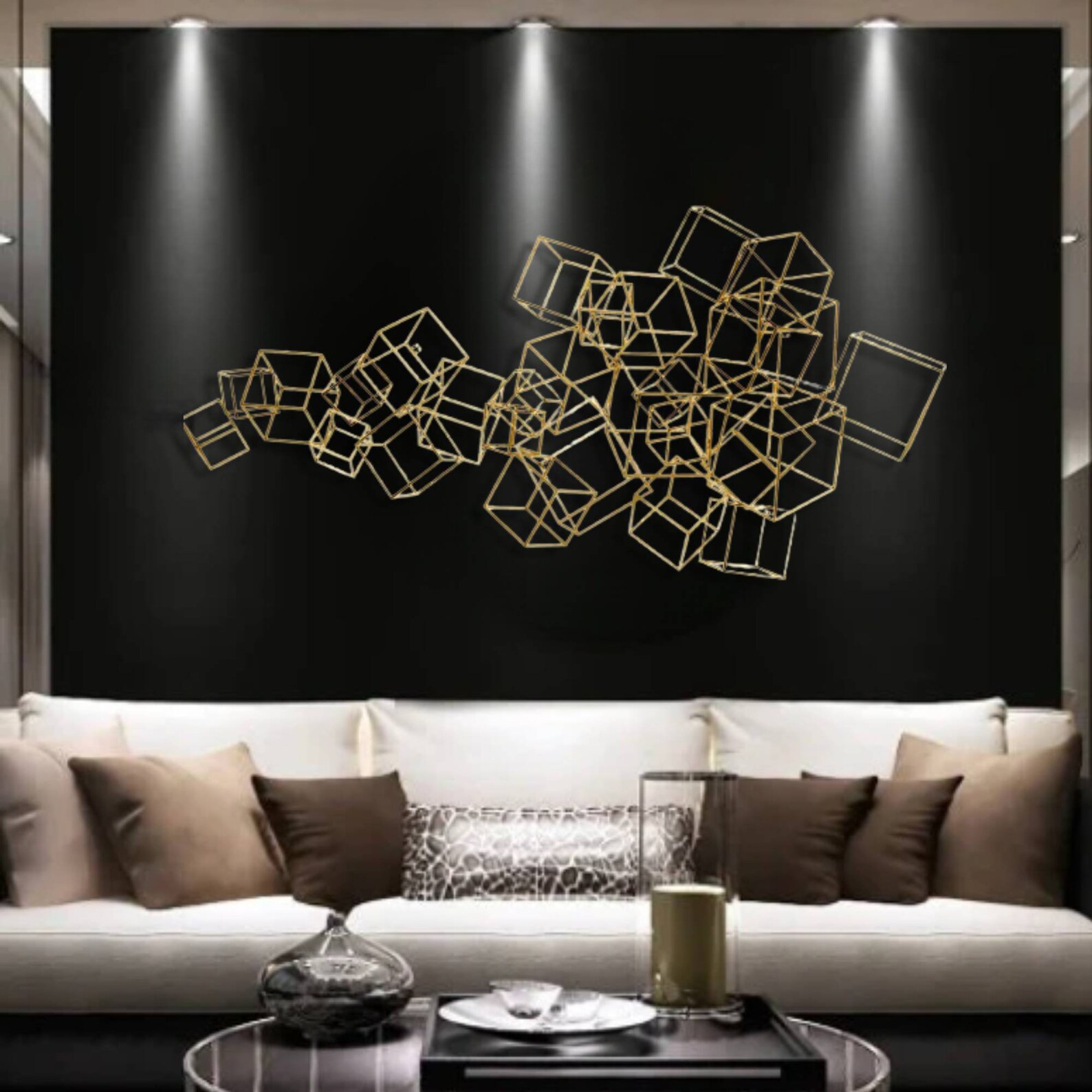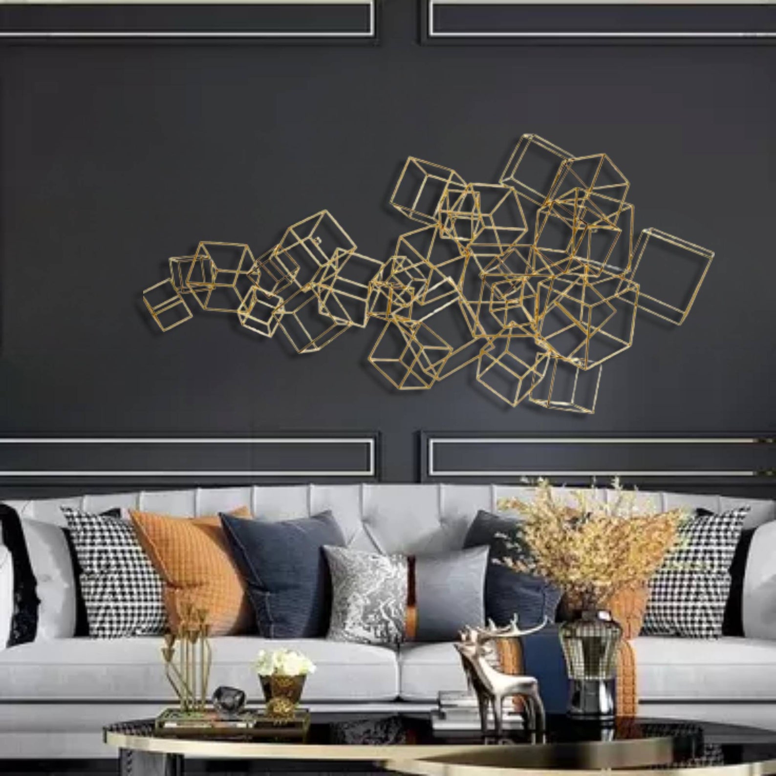 This metal wall art a best gift idea.You may give this metal wall hanging as wall decoration present on many occasion, for example you may bring it to your mother,your new married friend as wedding gift or best friend as housewarming gift who recently buy a new house or who redecorate her home,your corporate gift for your collegue.This design of one of our floral wall decor collection may be named as geometric metal wall decor,metal lines sign for wall decor,metal lines wall art,contemporary metal wall decor,laser cut metal wall hanging,horizontal golden metal wall hanging,golden metal wall decor,luxury wall decor,magnifique wall hanging,over bed wall hanging, over dreasuar wall hanging,bedroom wall hanging,living room wall decor,cubes sign for wall,metal cubes for wall, golden metal cube sculpture for wall, metal cubes wall hanging,golden metal cubes design wall decor,