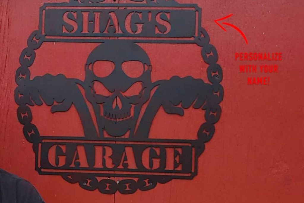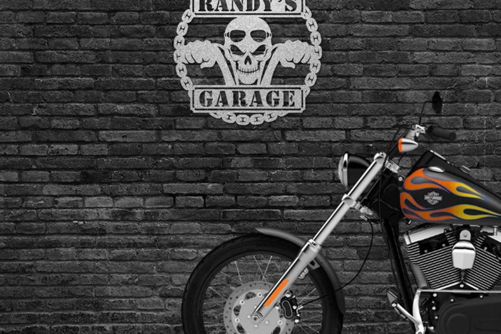 Sweet Ride9;s laser-cut Biker Skull Personalized Garage Sign is the perfect addition to your man cave or garage