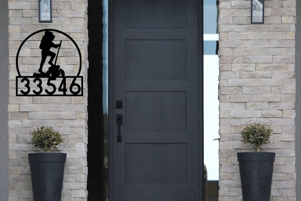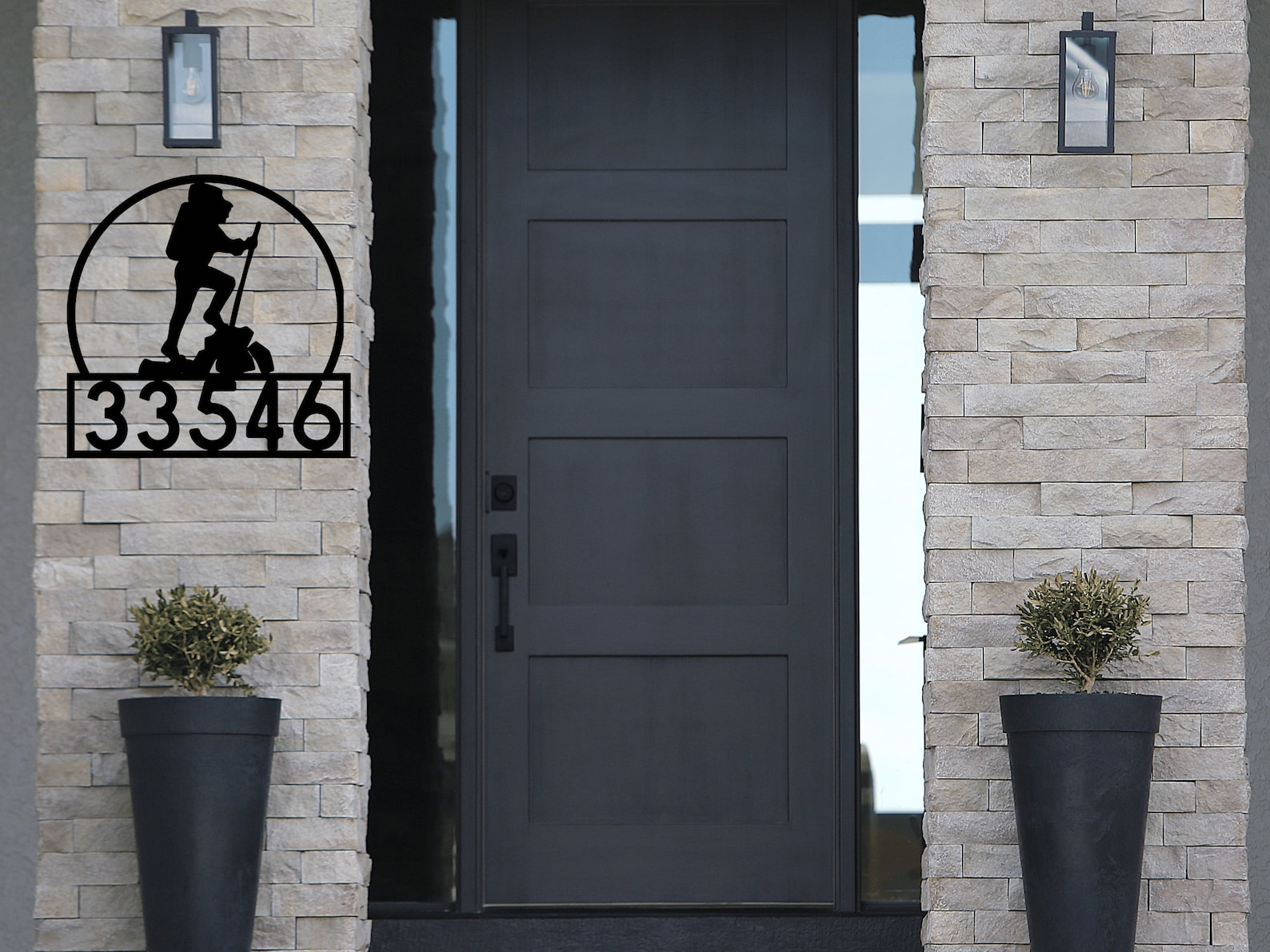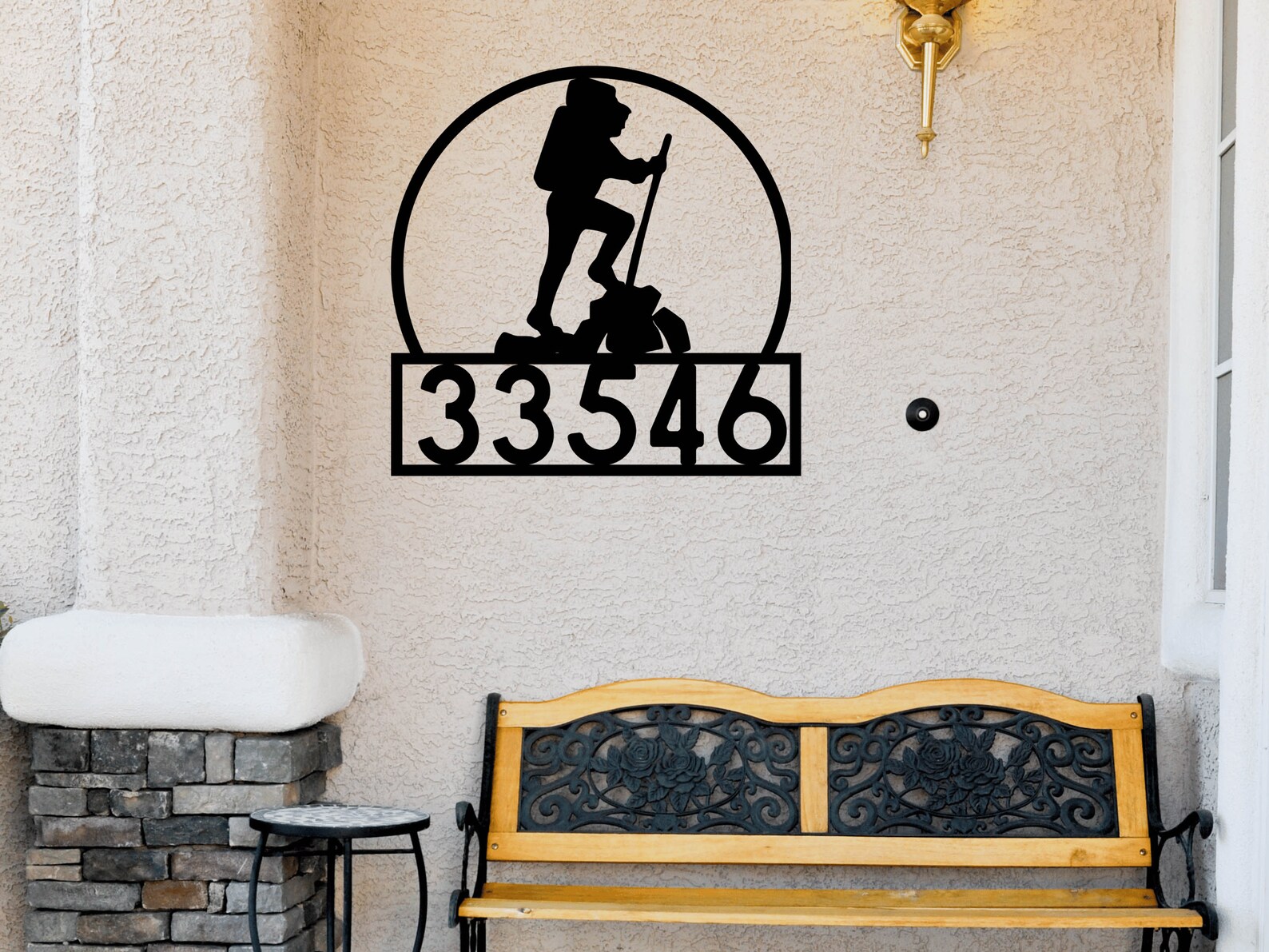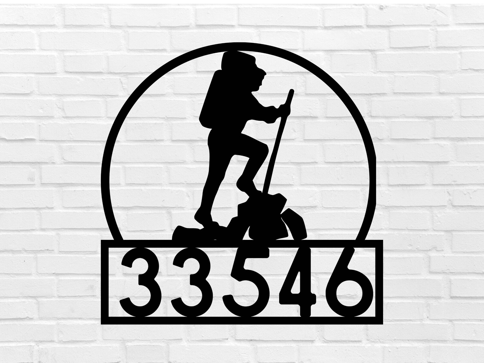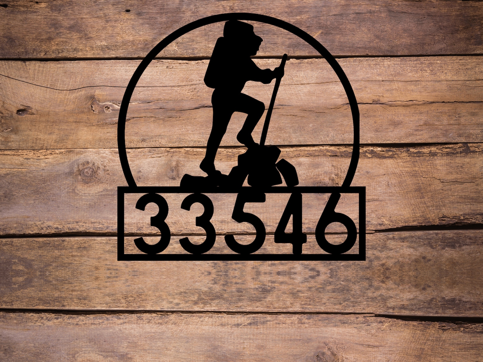 This custom address sign is perfect for adding a unique touch to your home. Its beautiful design features a hiker in the mountain range, adding a special rustic charm to your home and making your address visible to visitors. Crafted from durable, weatherproof metal, this sign is designed to withstand the elements and last for years to come. So if you9;re looking for a unique and creative way to display your house number, this sign is the perfect choice!