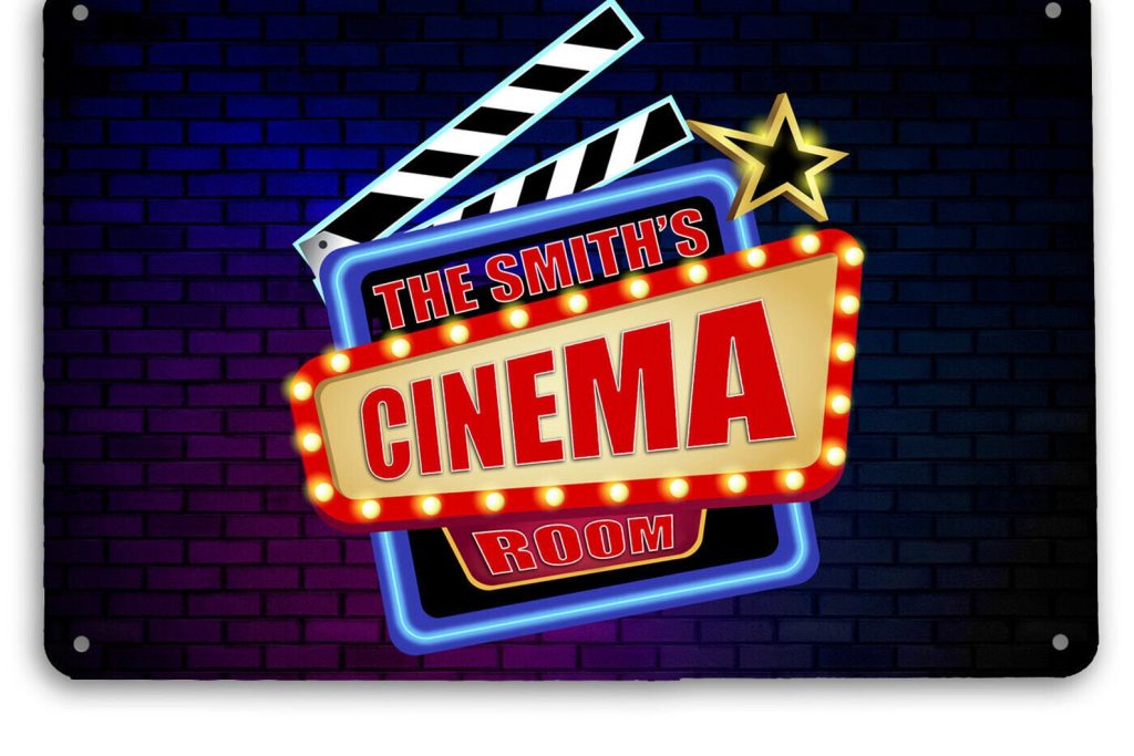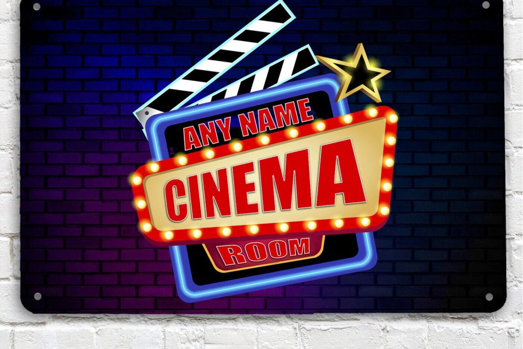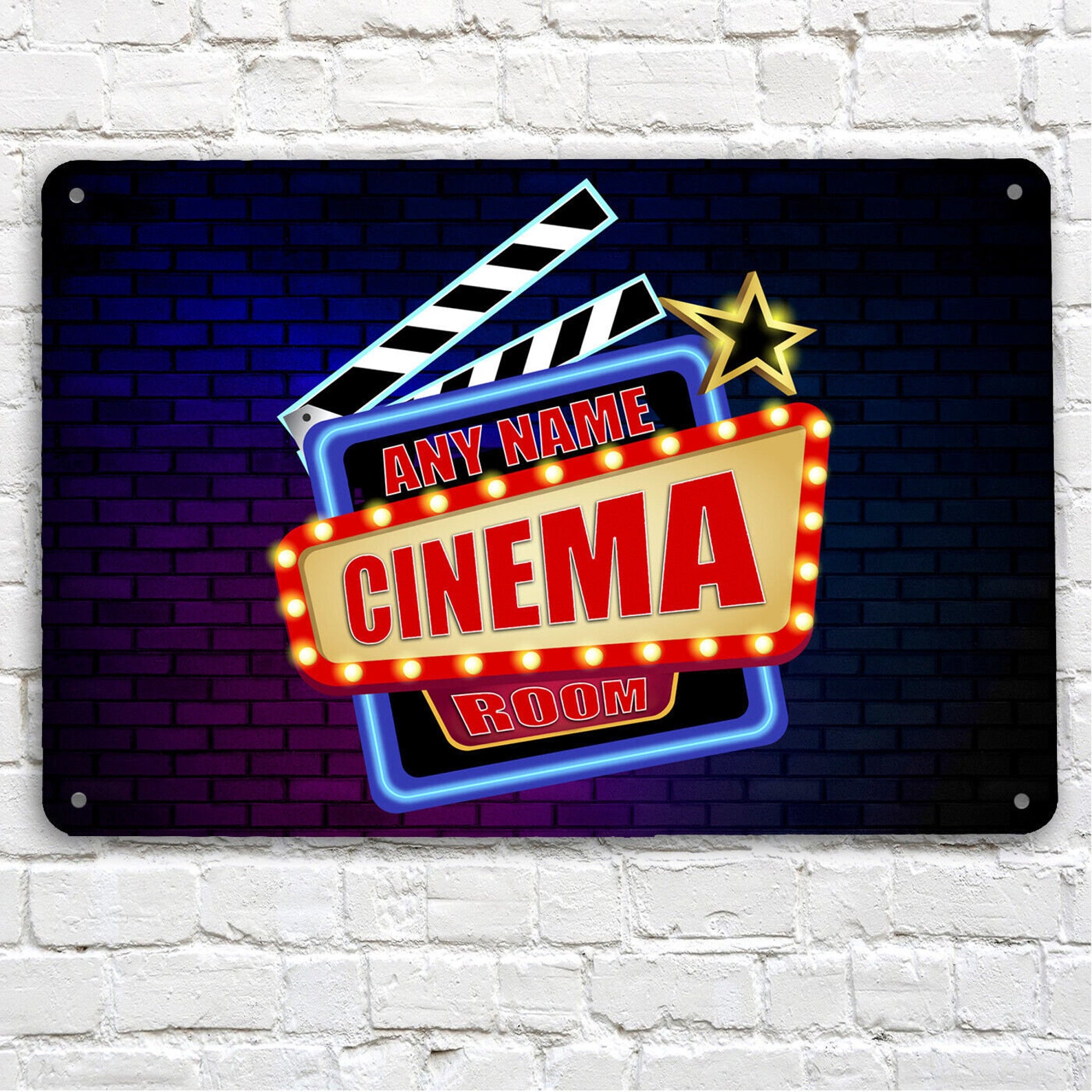 Personalised Home Cinema room – Clapper board Family Home Cinema metal A4 sign The bar sign is oversize A4 size predrilled with 4 holes so you can fix to the wall or hang with string or ribbon. This Bar sign is printed on quality Aluminium with a sheen finish, rounded corners and 4 holes. the sign is printed using the latest dye sublimation printing.