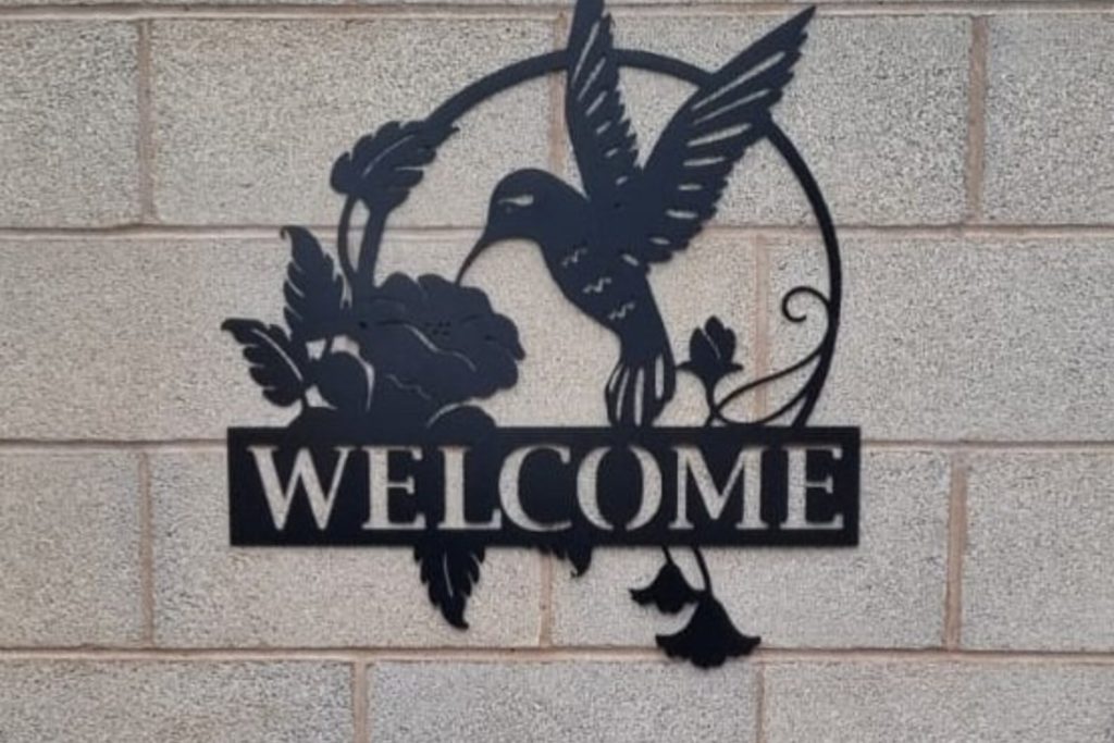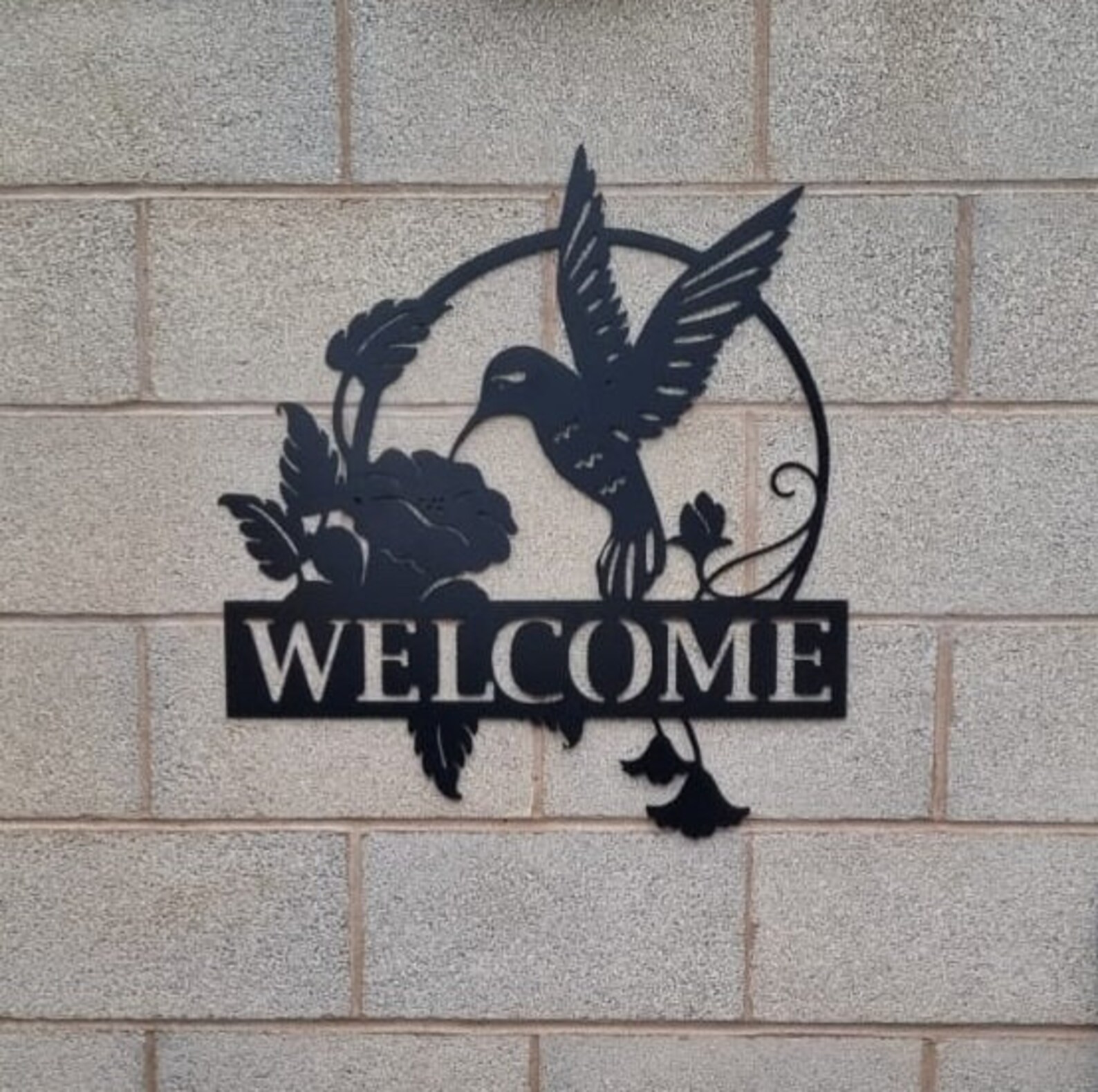 A beautiful Hummingbird welcome sign that you will enjoy for years! This welcome sign is made from 2mm steel and powder coated in black or rustic featuring a hummingbird feeding on a flower. This stylish piece will showcase your love for the garden for generations.