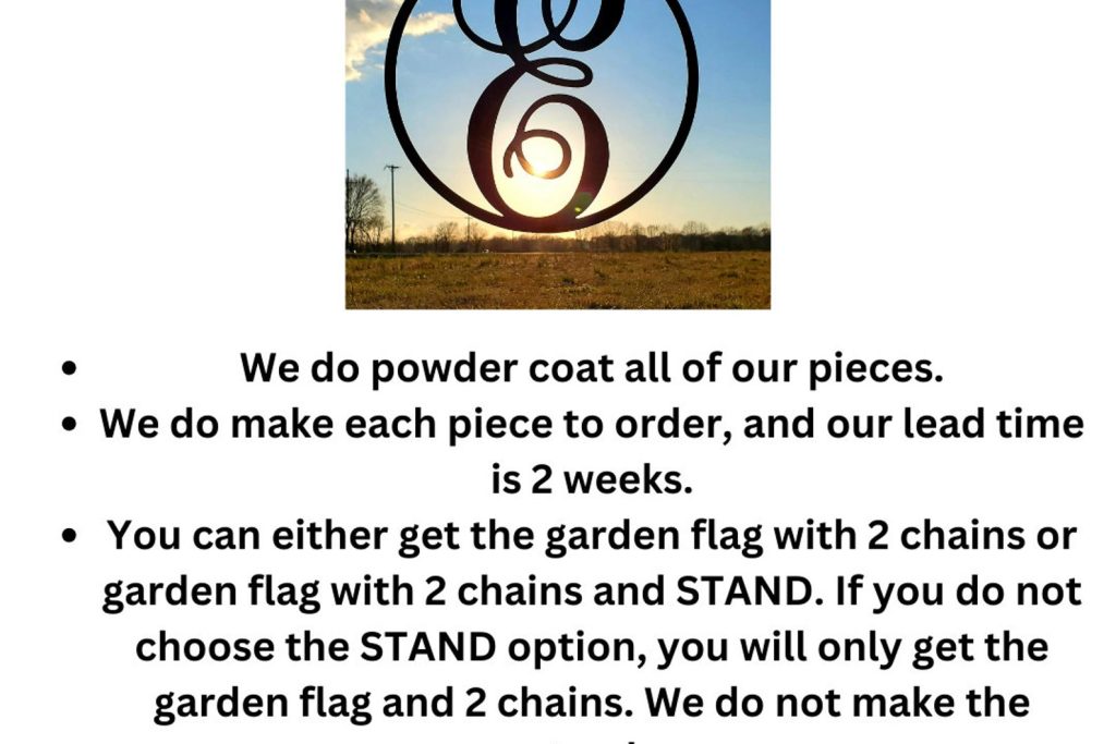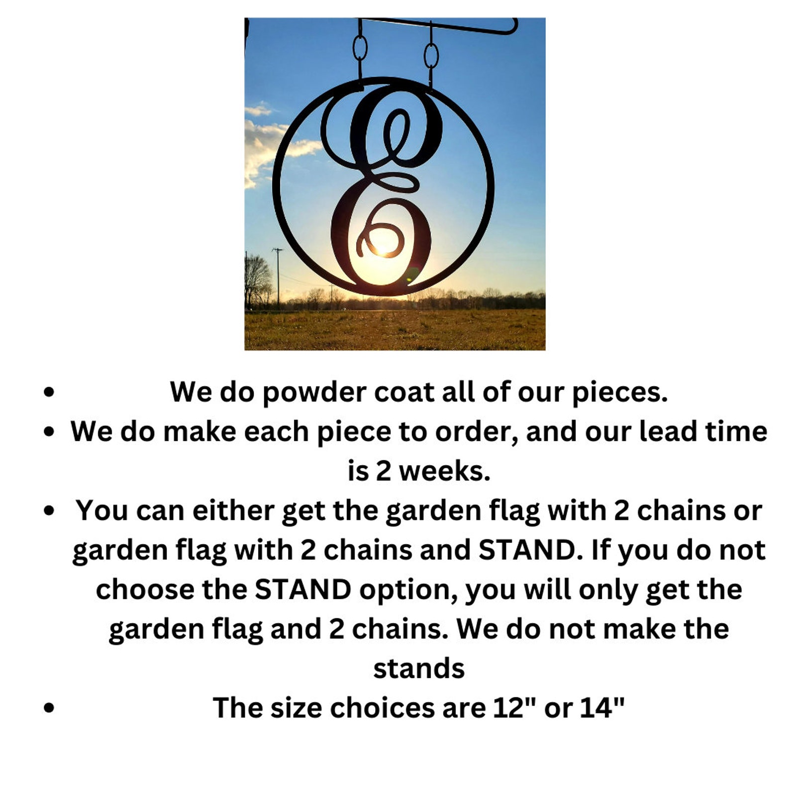 Love Garden Flags but hate how they tear or fade over time? Get this Metal Initial Garden Flag that is powder coated to be durable and last and is also weather resistant!! Made out of 16-gauge metal! We can do any letter you would like! **PLEASE LEAVE IN THE NOTES WHAT LETTER YOU WOULD LIKE**