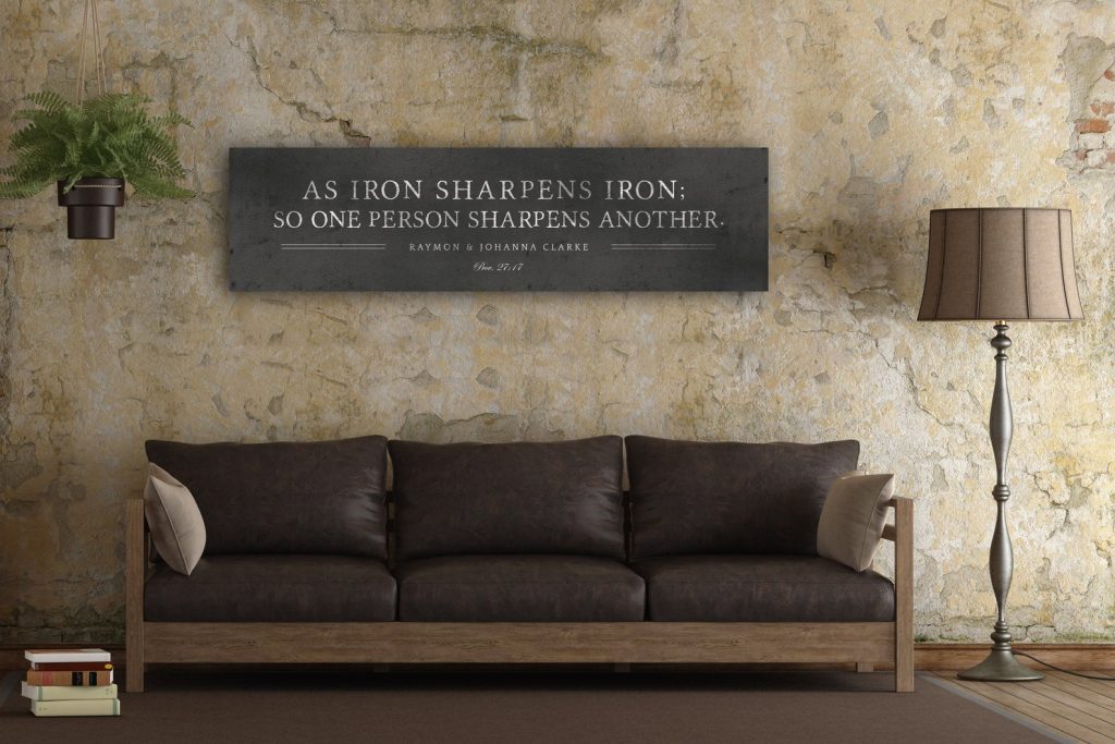 Iron Sharpens Iron Sign. This Custom Metal Art Print makes a lovely wedding gift and is personalized with the couple9;s names. and features, "As Iron Sharpens Iron" . Or celebrate ten years with this tin anniversary gift. With the look of cast iron, this pieces makes a great 6th anniversary gift too.