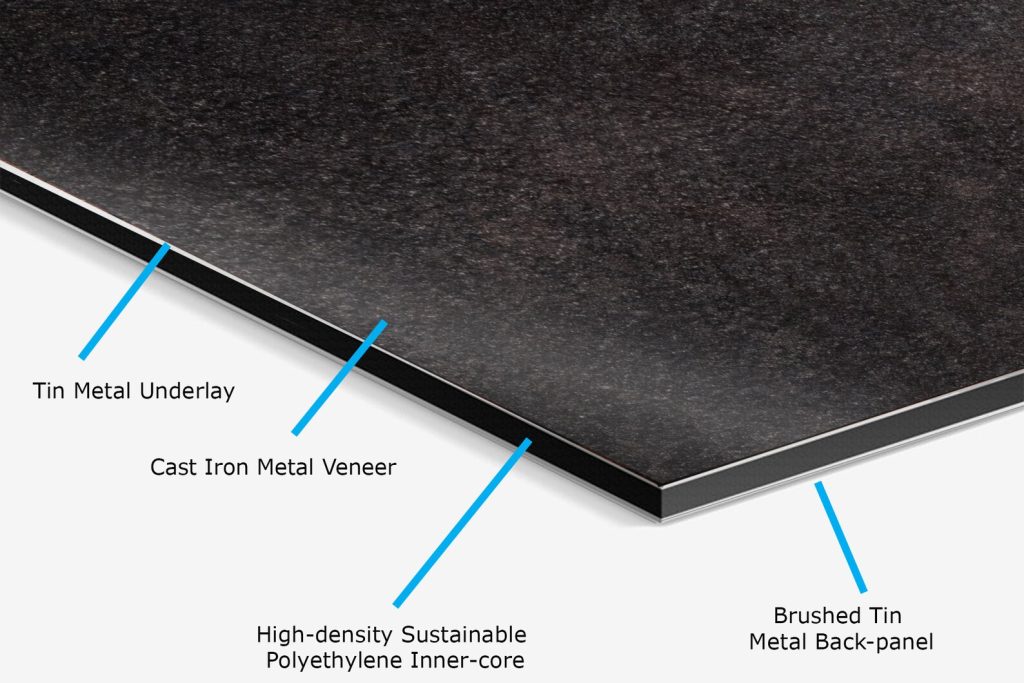 Cast-Iron-alloy veneer, bonded to a aluminum face-plate, and fused to a solid polyethylene core in a continuous extrusion process with a brushed aluminum back-plate for a clean finished look