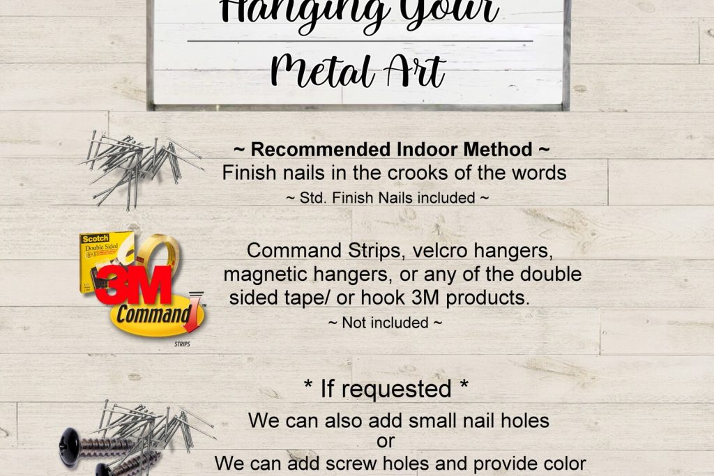 ~ This piece comes standard with nails for hanging and no holes (3M tape can also be used)