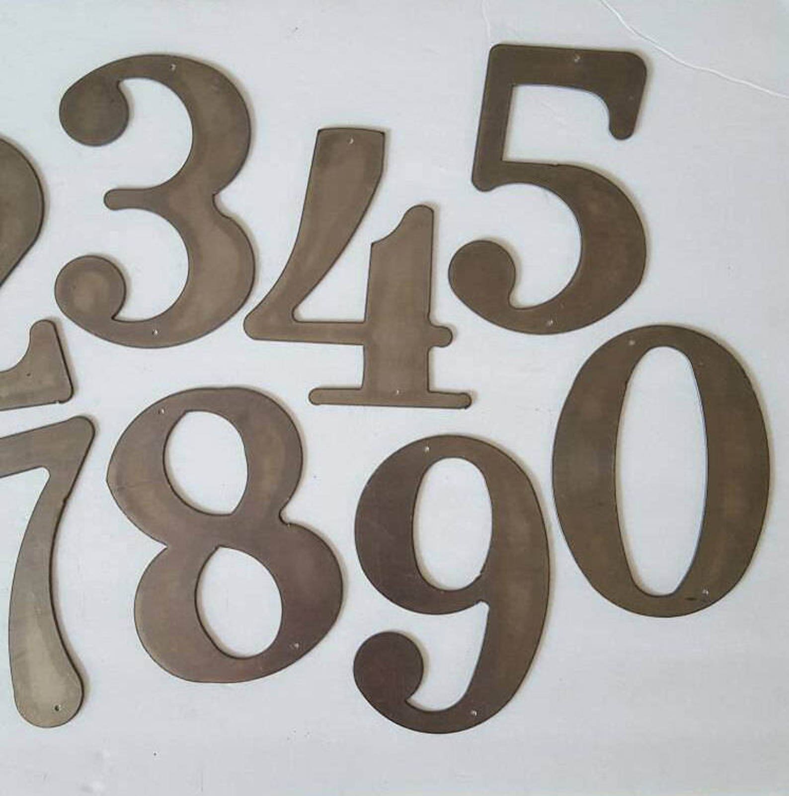 Large Metal House Numbers & Letters are approx. 10" high. Choose unpainted or painted with black rustoleum paint, Hammer Gray, or White. (Shown unpainted). 14 Gauge metal. For Home or Office. Apartment numbers, door numbers, etc. Also great shelf decor. Birthday, Christmas, or Housewarming gift. Holes drilled in them for hanging. Put in the personalization the numbers you need
