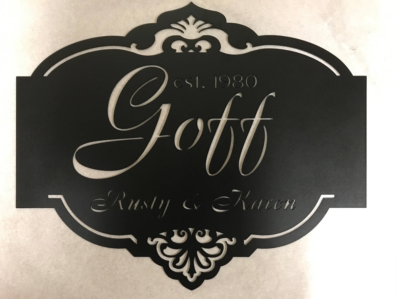 Metal laser cut sign personalized with your name finished in baked on black powder coat finish. measures 22"". Makes a very elegant statement to your front entrance. You can also add first names or Est. date Our finish is a baked on powder coat for extremely durable, long lasting finish