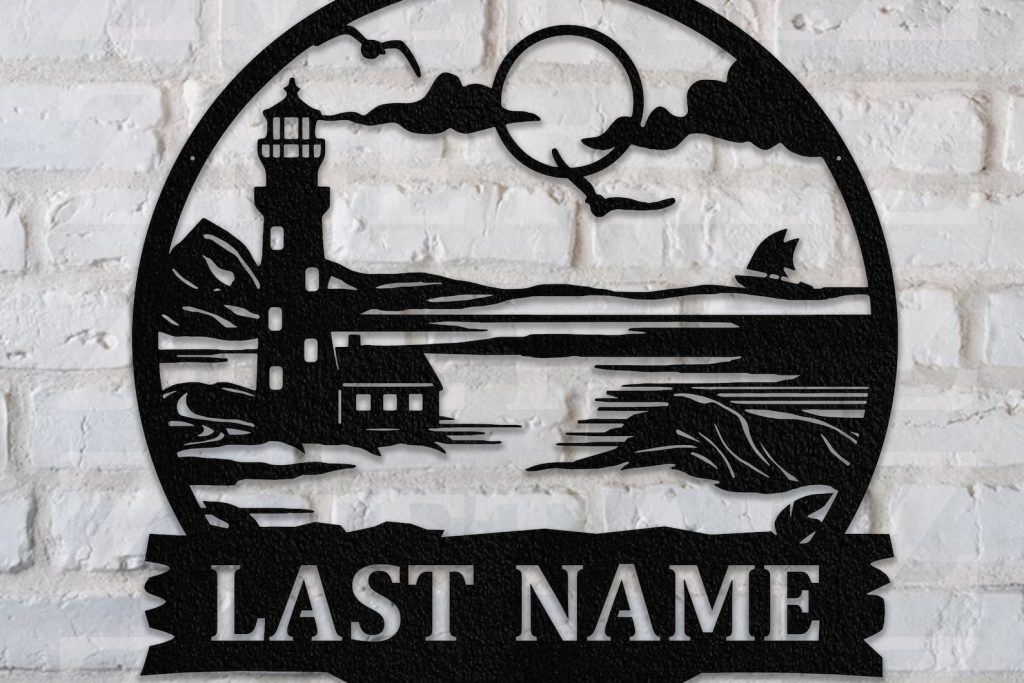 Lighthouse Sunset Sign – Personal Metal Monogram, Wedding Gift, Outdoor Name Sign