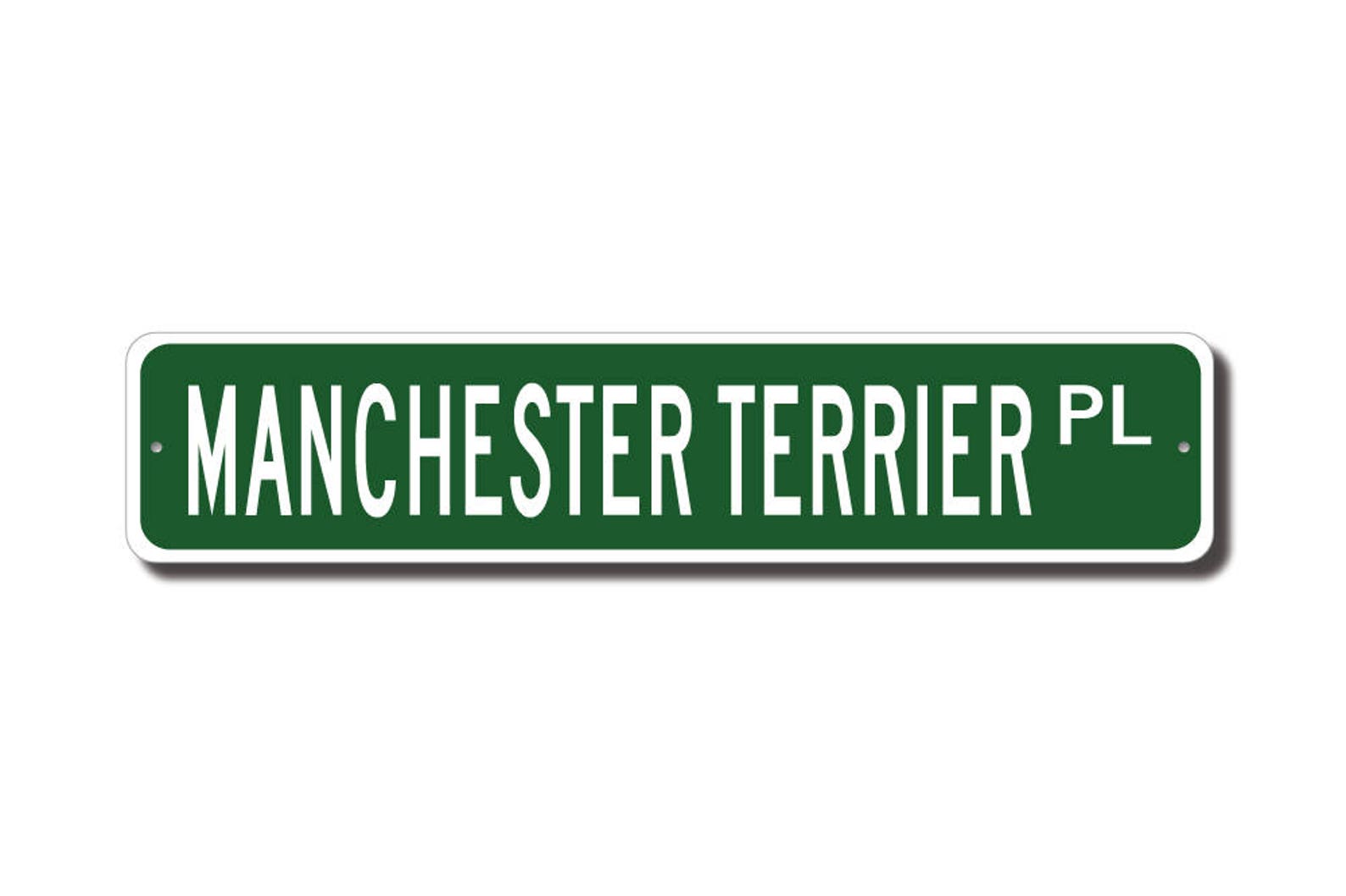 Manchester Terrier lovers check out this awesome street sign! This will make the perfect piece for any Manchester Terrier lover or Manchester Terrier cave. Made of premium aluminum it will stand the test of time. This sign will look great in any room, garage, barn or office! Get this sign for your favorite friend that loves a Manchester Terrier !