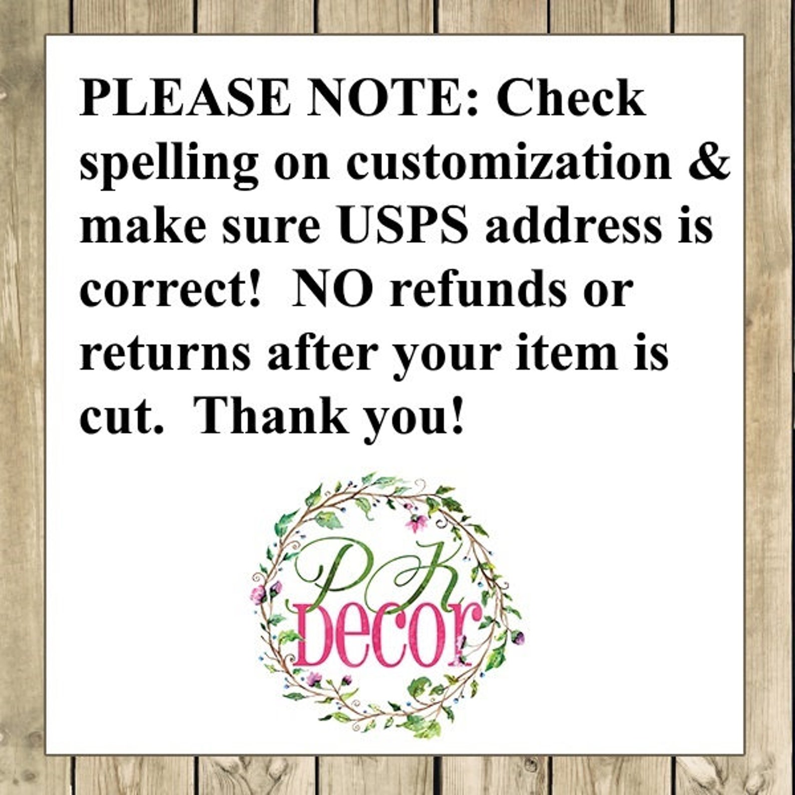 PLEASE STOP and read below about the material you are purchasing and order details!!! (no reimbursements/returns after your item is cut as they are custom) WE START ON YOUR ORDER AS SOON AS YOU PAY! MAKE SURE SPELLING AND USPS ADDRESS ARE CORRECT! We are not responsible for your typos/mistakes! If your order returns to us due to incorrect address you will receive an invoice for reshipment. We have a no return/refund policy.