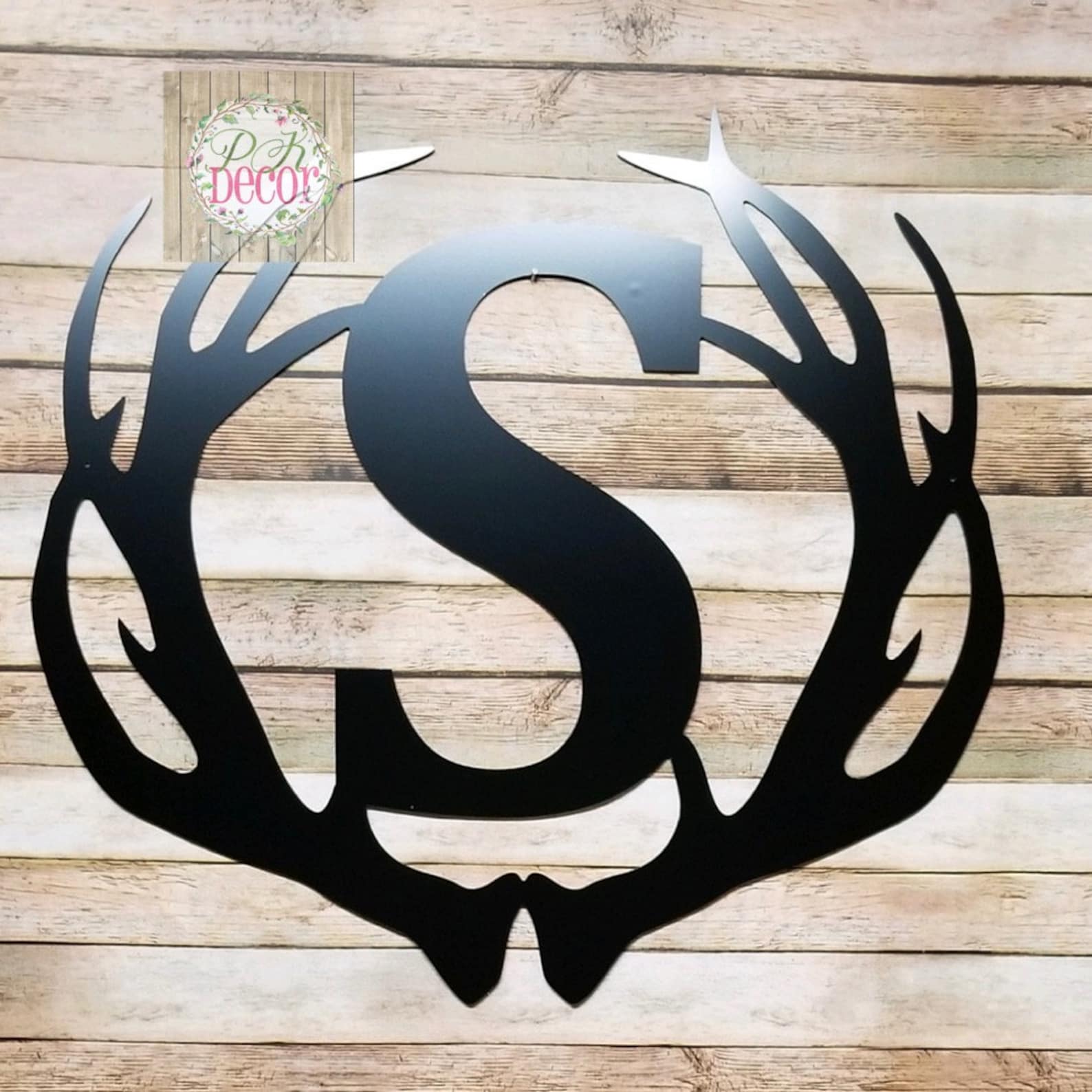 Welcome guests into your home with this Custom Metal antler Initial Door Hanger. Our Deer Antler Monogram Sign is 24" side and approximately 22" tall. This decor makes a great gift for your favorite deer hunter and his bride to decorate their home or man cave.