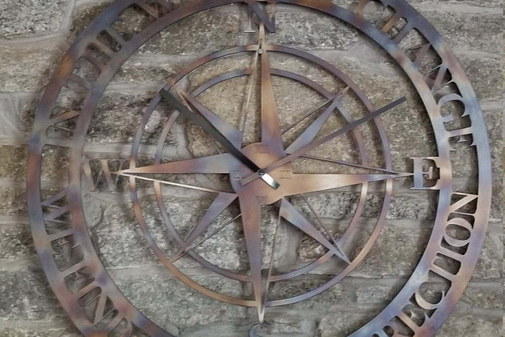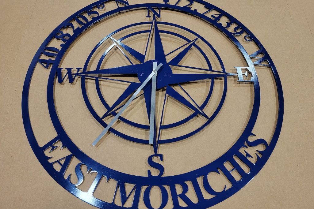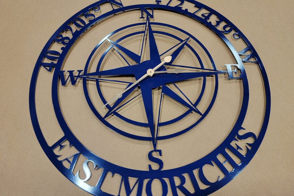 Custom made metal compass with your personal touch. A clock mechanism has been built into this design to also add a level of functionality to the item. Coordinates for your destination of choice can be added and name(wording) across the lower.
