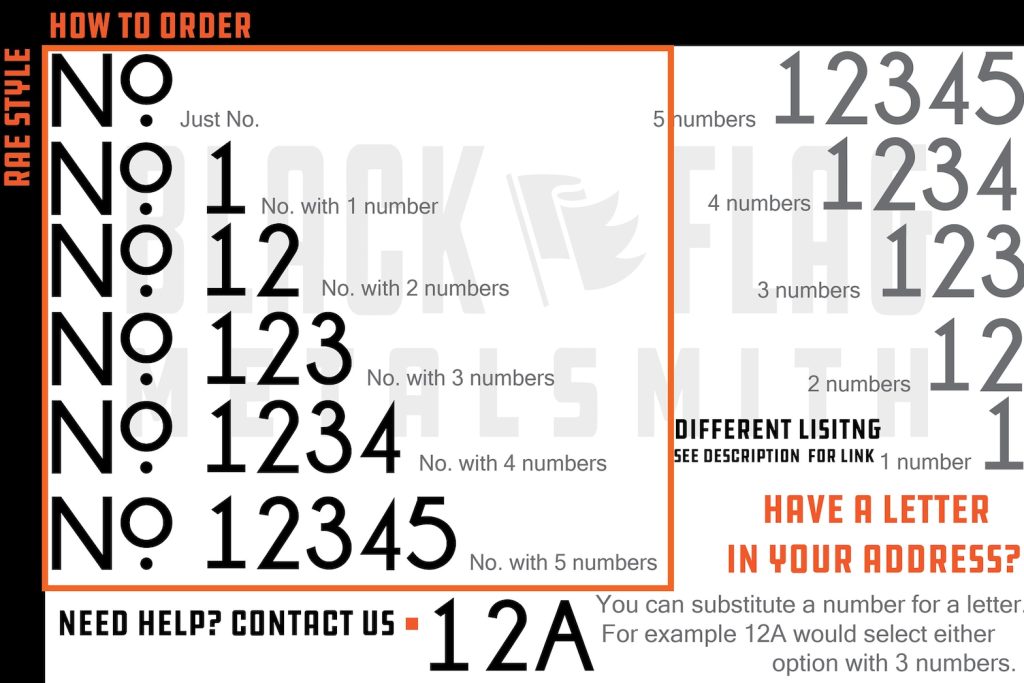 These numbers come with our premium exterior grade powder coating. Our standard colors are Satin Black, Satin Copper, Gold|Brass or Metallic Bronze.