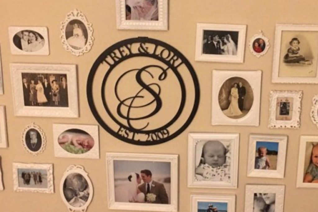 24" metal monogram with option to put first names and est, date. Makes a fabulous accent beside your front door or hanging on the gate or in a flower bed. Also a great photo wall centerpiece. Will bring many compliments. Also makes a very special gift for weddings, anniversaries or birthdays