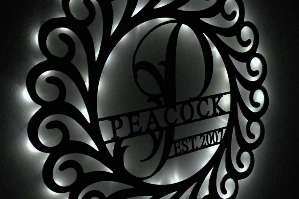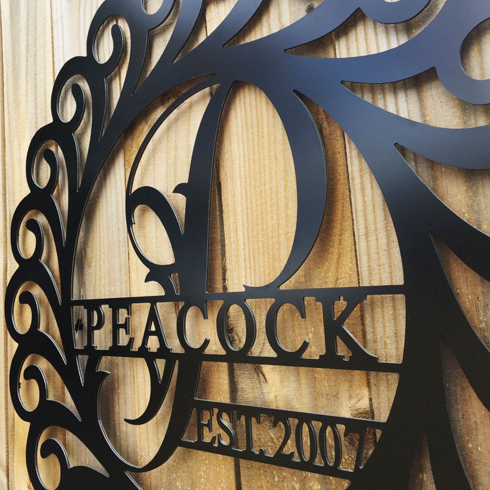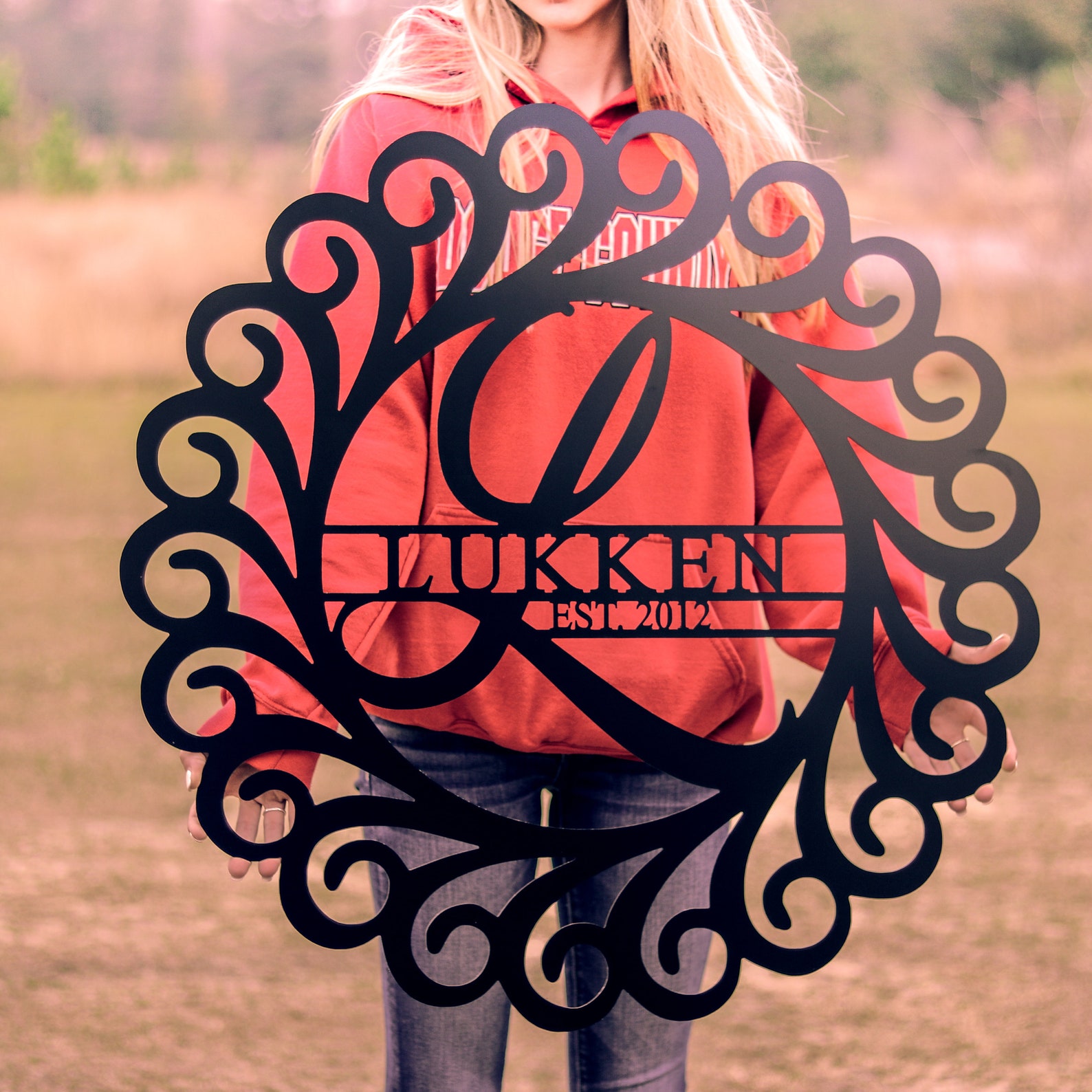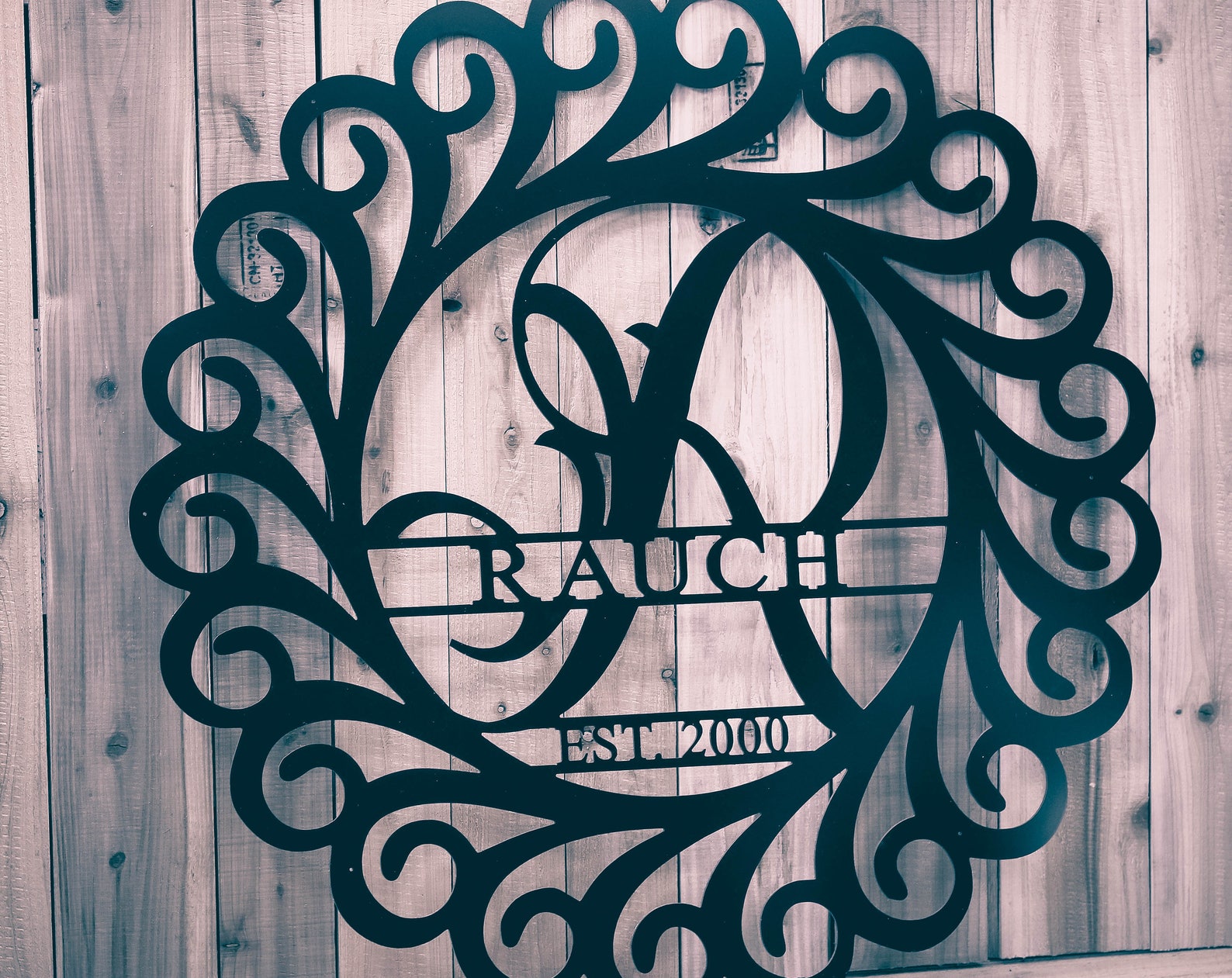 Our beautiful personalized aluminum decorative custom metal signs are made to last. The material we use is an aluminum composite panel which is a multi-ply lightweight yet durable choice for custom signs. This abstract metal sign features your last name, big initial, and date established whether it9;s your wedding date, anniversary date, or any special day. Perfect housewarming gift! This is an original design and the finished sign measures approx 30" x 30" We offer several different finishes and no mounting hardware is incl. You could also add lights to this if you prefer as shown in one of the photos. We mounted this sign on our privacy fence which really added a very unique personalized touch to our outdoor fence decor. It could easily be mounted or hung on a wall or door too! We also offer custom aluminum signs.