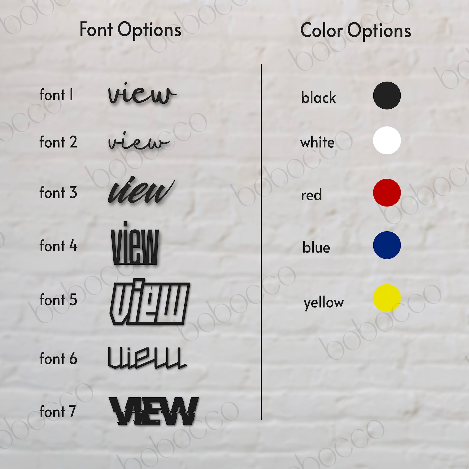Introducing our Metal View Sign, the perfect addition to any contemporary home decor. This wall hanging sign is made of high-quality metal and is laser cut for precision and durability. It comes in five different sizes, ranging from 10 inches to 55 inches, and five different color options, including black, white, red, blue, and yellow.