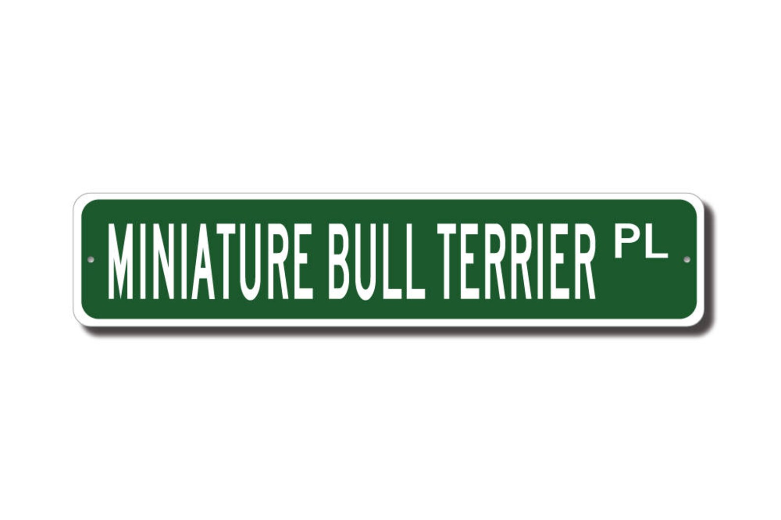 Miniature Bull Terrier lovers check out this awesome street sign! This will make the perfect piece for any Miniature Bull Terrier lover or Miniature Bull Terrier cave. Made of premium aluminum it will stand the test of time. This sign will look great in any room, garage, barn or office! Get this sign for your favorite friend that loves a Miniature Bull Terrier !