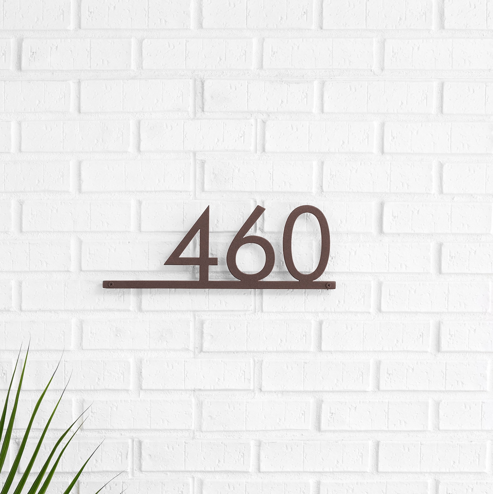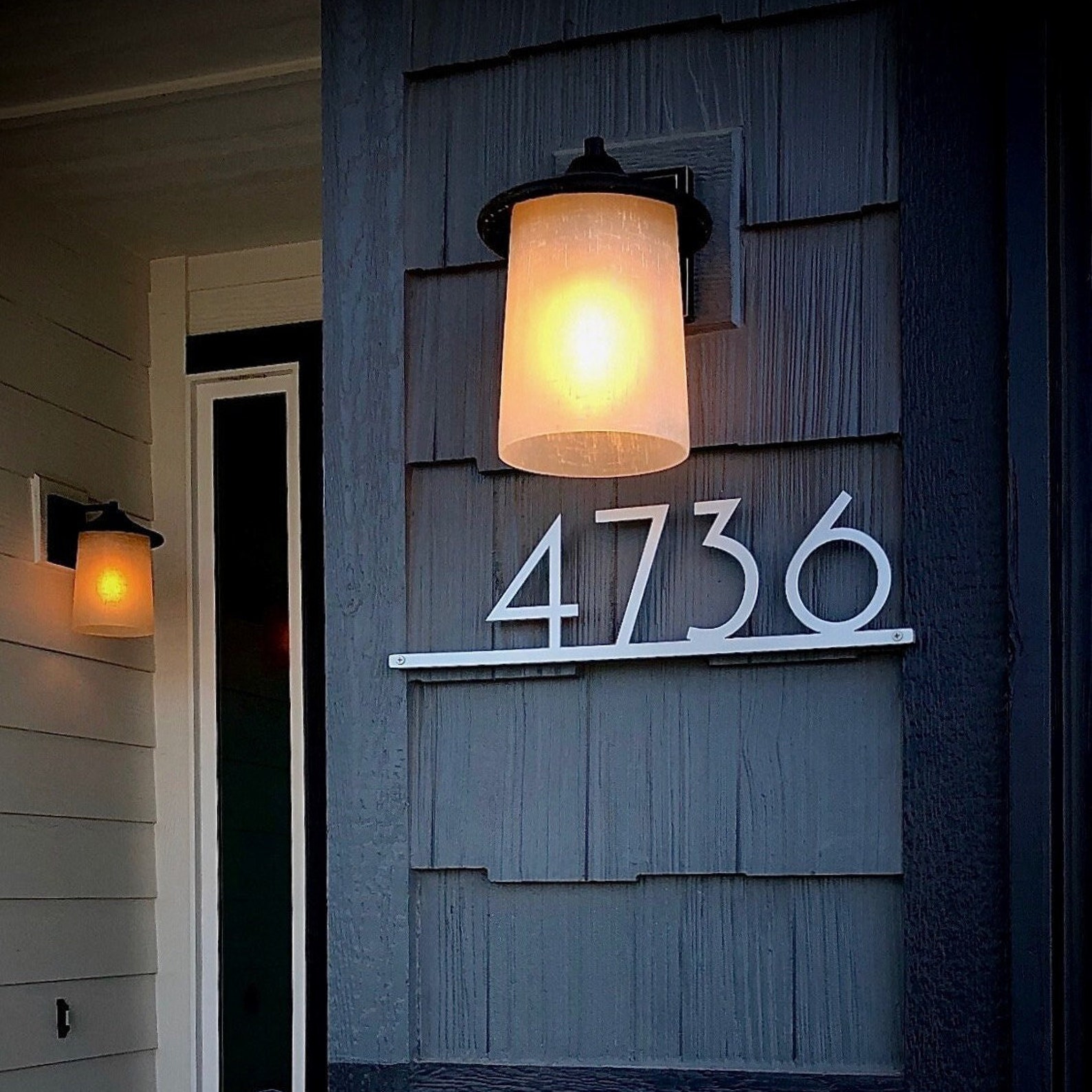 This address sign is made to order in Austin, TX and is constructed of 4"H, 5"H, 6"H, 7"H or 8"H steel numbers. The sign is cut from a solid piece of 1/8" thick 11-gauge steel using our CNC plasma table for a clean appearance. The underline portion is welded to square tubing for added depth and finished in your choice of our signature hand-finished rust patina or powder coated finishes: black, charcoal grey, silver, white, brass or brown. The sign features two pre-drilled holes at each end and two screws with the same finish for ease of installation. We also send along matching 1/2" aluminum spacers to allow the sign to float off the wall even more and cast some very cool shadows.