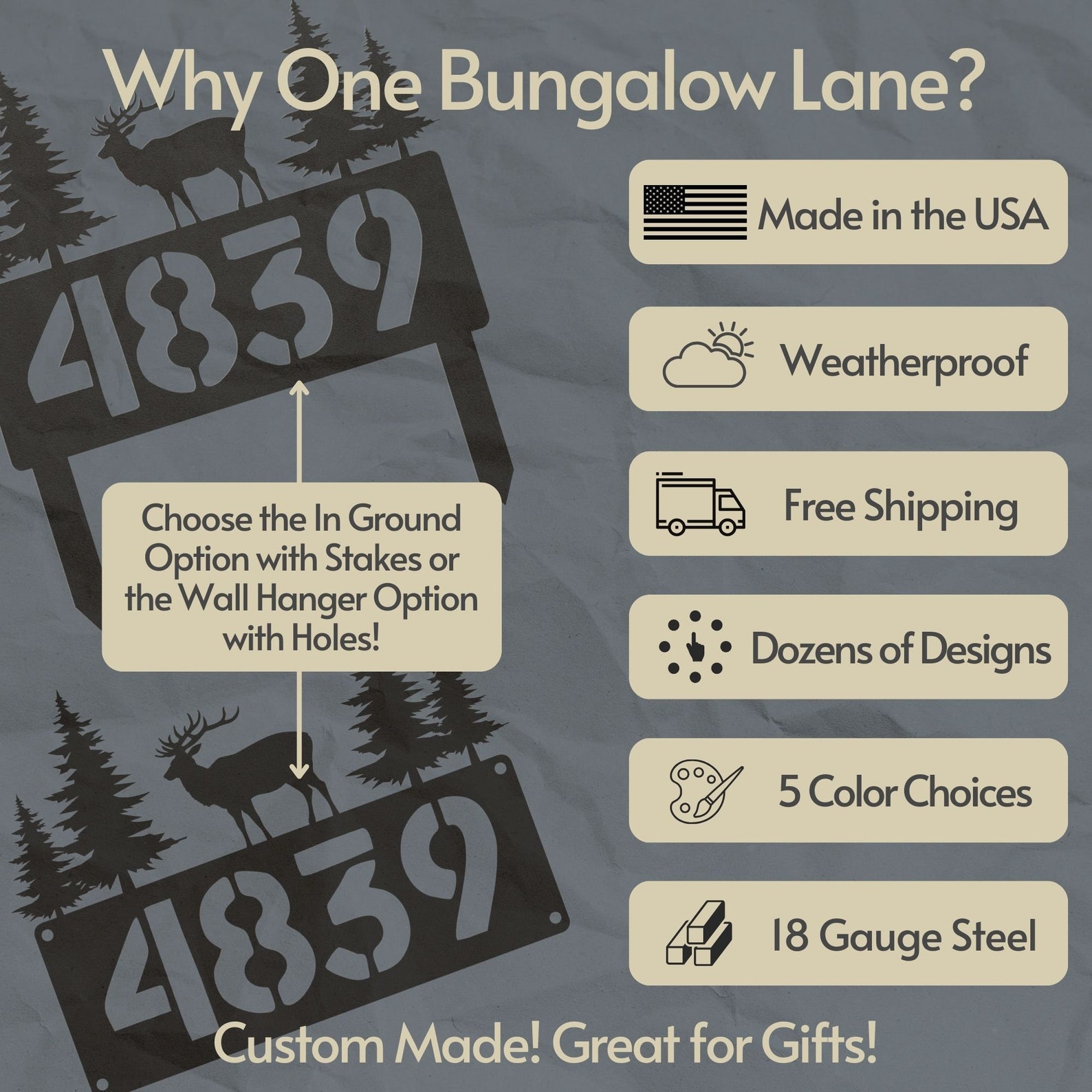 Elevate your outdoor space with our exquisite steel lawn address signs, seamlessly blending nature-inspired designs with functional elegance. At One Bungalow Lane, we take pride in our craftsmanship and personalized charm. Whether displaying your address, family name, or a combination of both, our signs infuse a unique touch into your abode.