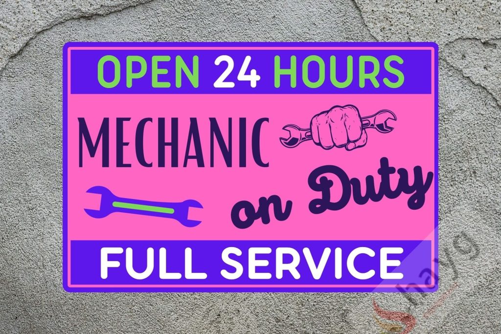 Open 24 Hours Mechanic on Duty Full Service Aluminum Sign, Decorative Metal Signage, Decor for Bedroom