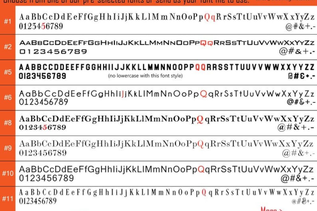 If no font choice is specified when ordering, Font #1 is the default for this listing.
