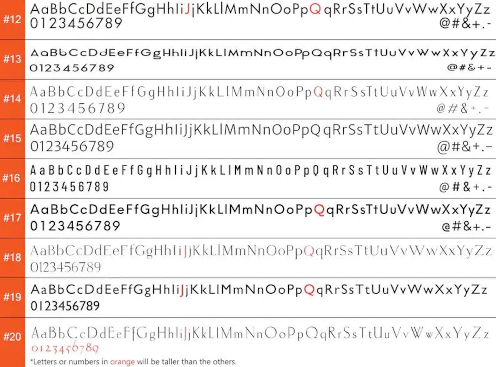 We also have a cursive font available – message us for a price quote. For orders with upper and lowercase letters, or all lowercase letters, the font size will be for the tallest letters in the text. All other letters will be the standard proportional size. We can also do symbols like . & $ @, custom logos, or whatever else you might need.
