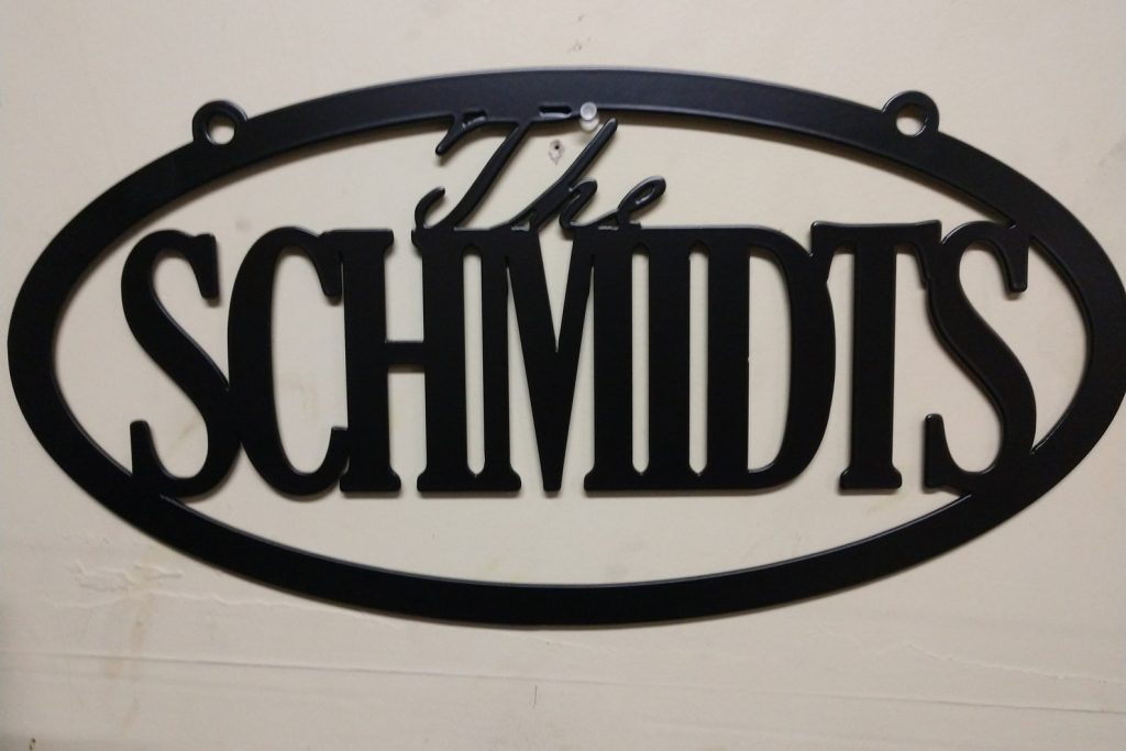 This 16 gauge sturdy metal sign will be personalized with your last name. It measures approximately 20"W x 10"H and has loops for hanging. It is made for interior or exterior use with a matte black powder coat finish.