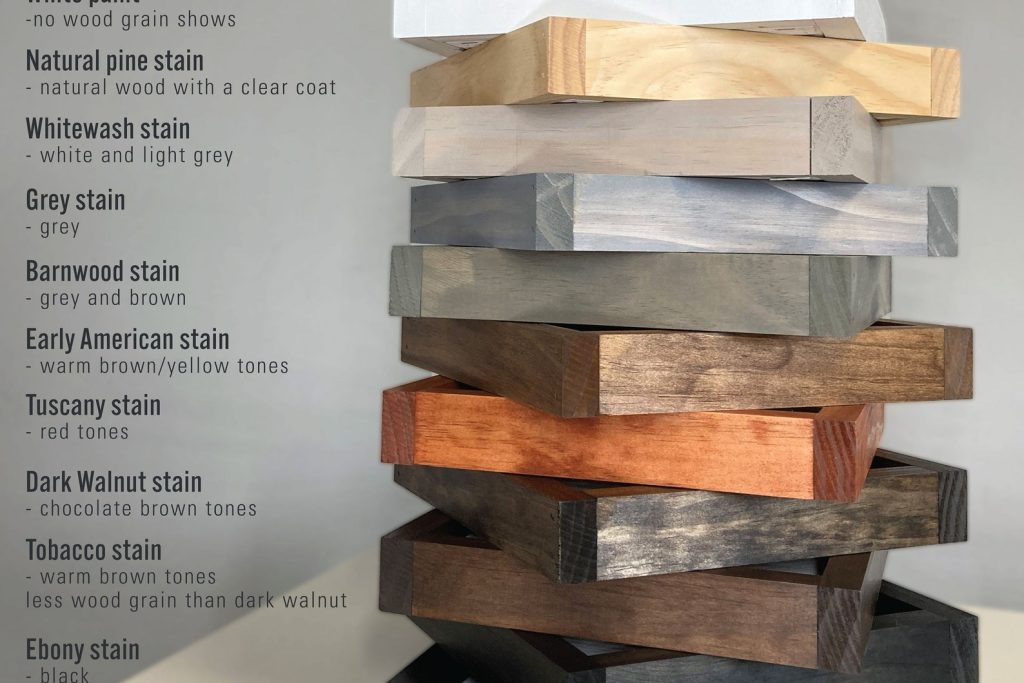 The sizes listed represent the printed area of each print. Our traditional canvases are 7/8 in depth. If you order a custom frame, it adds an extra 1.5 of height and 1.5 of width! The depth with our frames is 1.5. We offer several different stain options for you to choose from: White, Natural Pine, Whitewash, Grey, Barnwood, Early American, Tuscany, Dark Walnut, Tobacco, Ebony, and Black.
