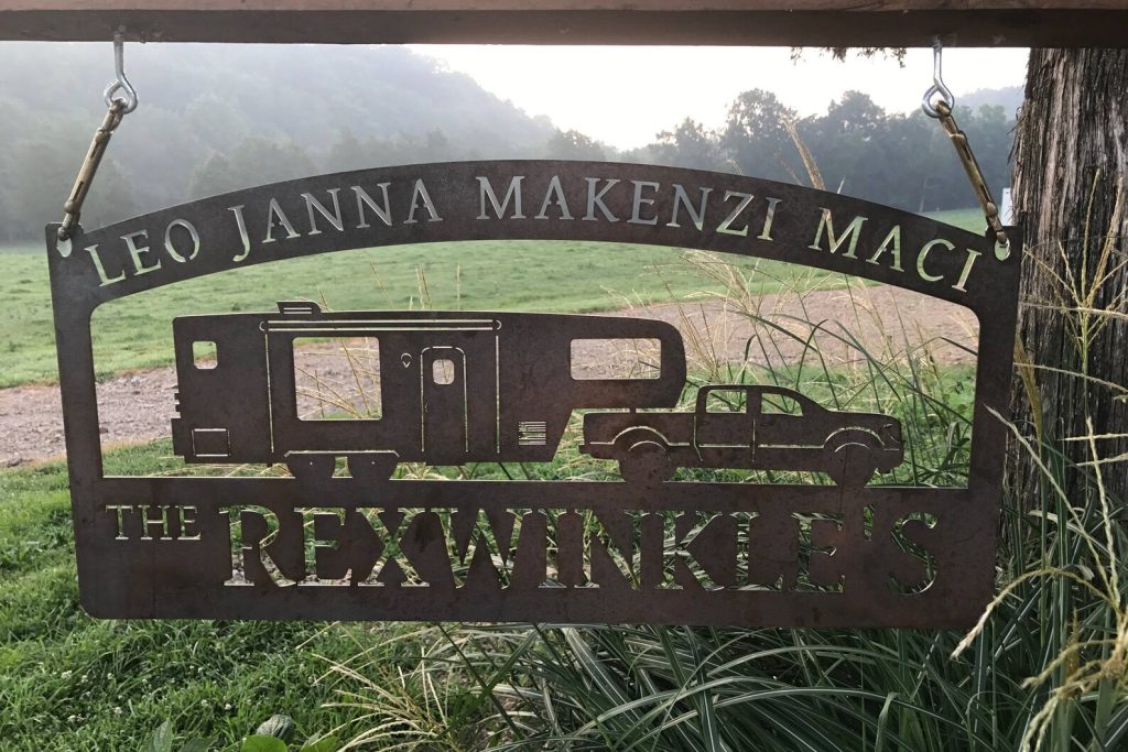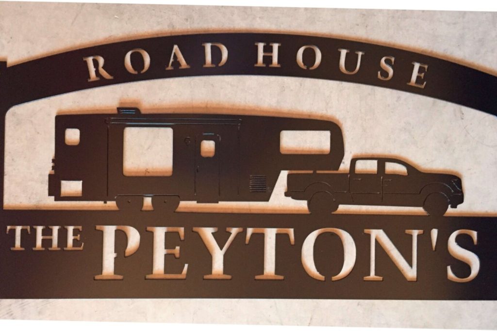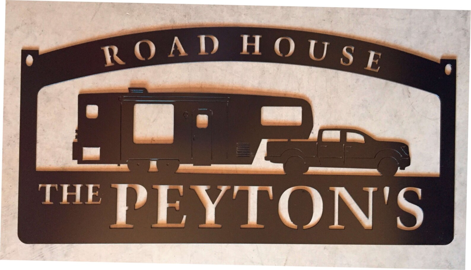 Metal laser cut sign personalized with your name finished in gorgeous, black or bronze, or copper acid wash with baked on clear coat, measures 26"". . Makes a very special gift! Great for the campground!