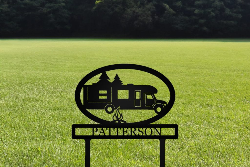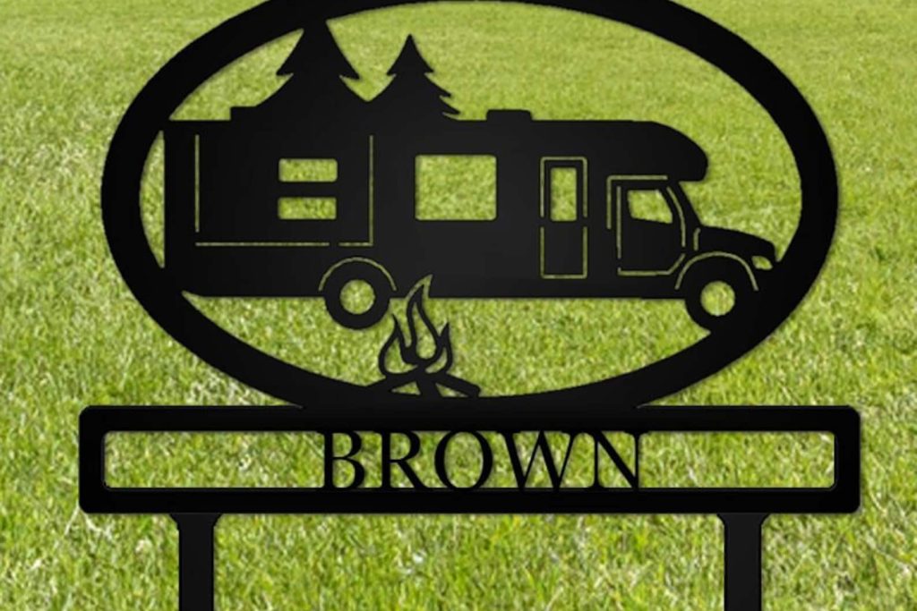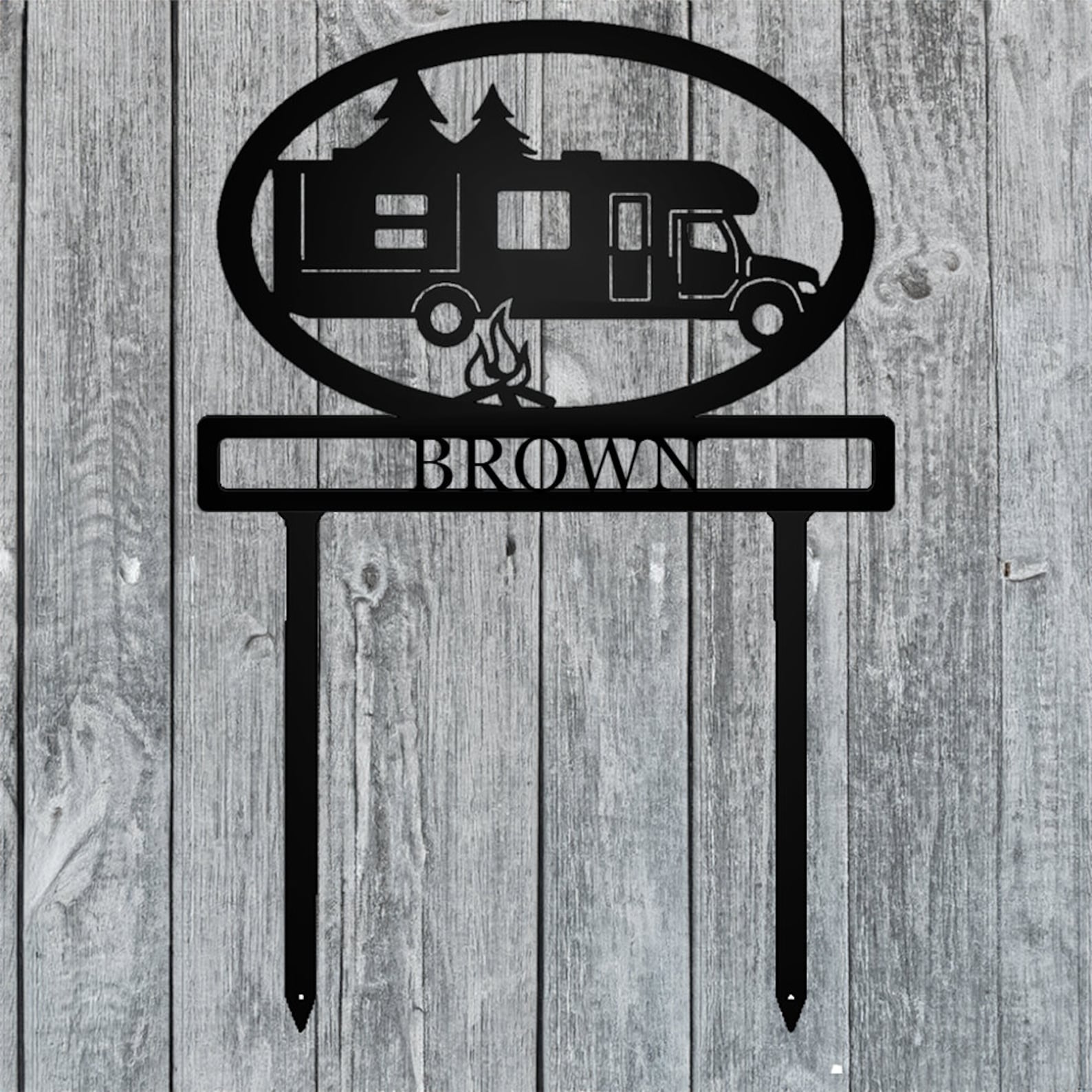 Campers…this is for you!Personalize your own camper sign. This metal "Class C" camper sign is the perfect sign for your camping trip or for a friend who loves to camp. Push by hand or pound into the ground with a rubber mallet. Made using super-durable 11 gauge steel and powder coated black.Add a personal touch by adding a name.