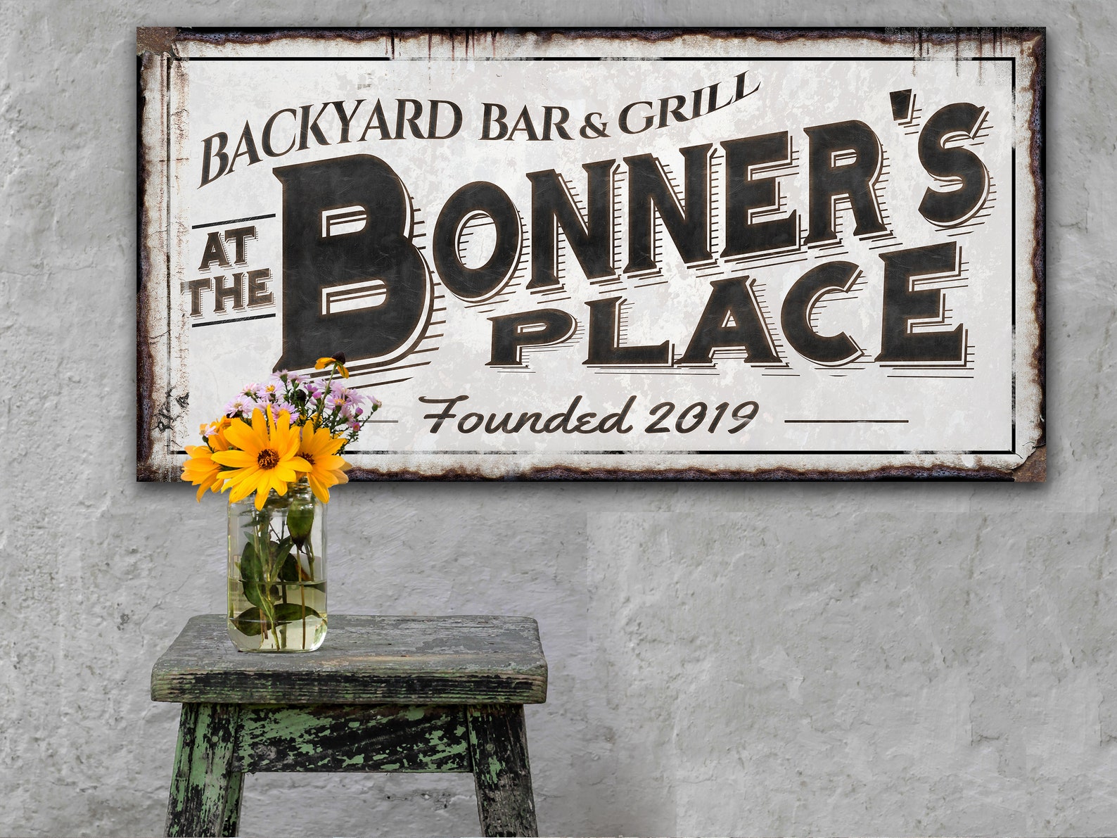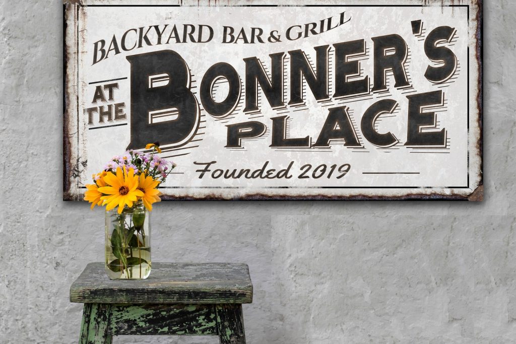 Uniquely Personalized Art for Indoor or Outdoor Display! Hang this retro, primitive farmhouse, backyard bar & grill sign anywhere inside or outside your home. Your choice of canvas or metal makes this the perfect fit for your country porch, kitchen or living room. It makes a great gift for dad or the perfect anniversary or wedding gift!