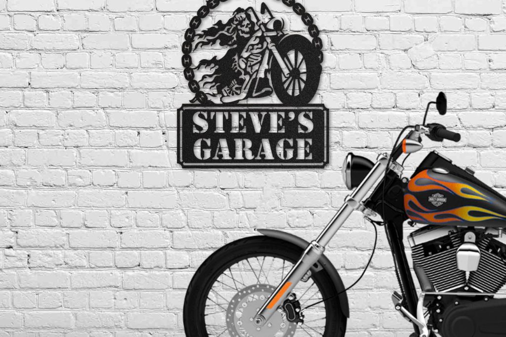 Sweet Ride9;s laser-cut Biker Skull Personalized Garage Sign is the perfect addition to your man cave or garage