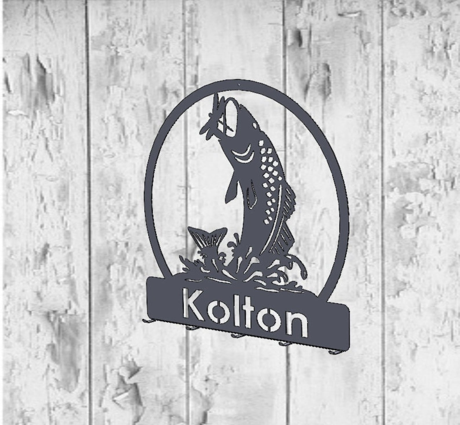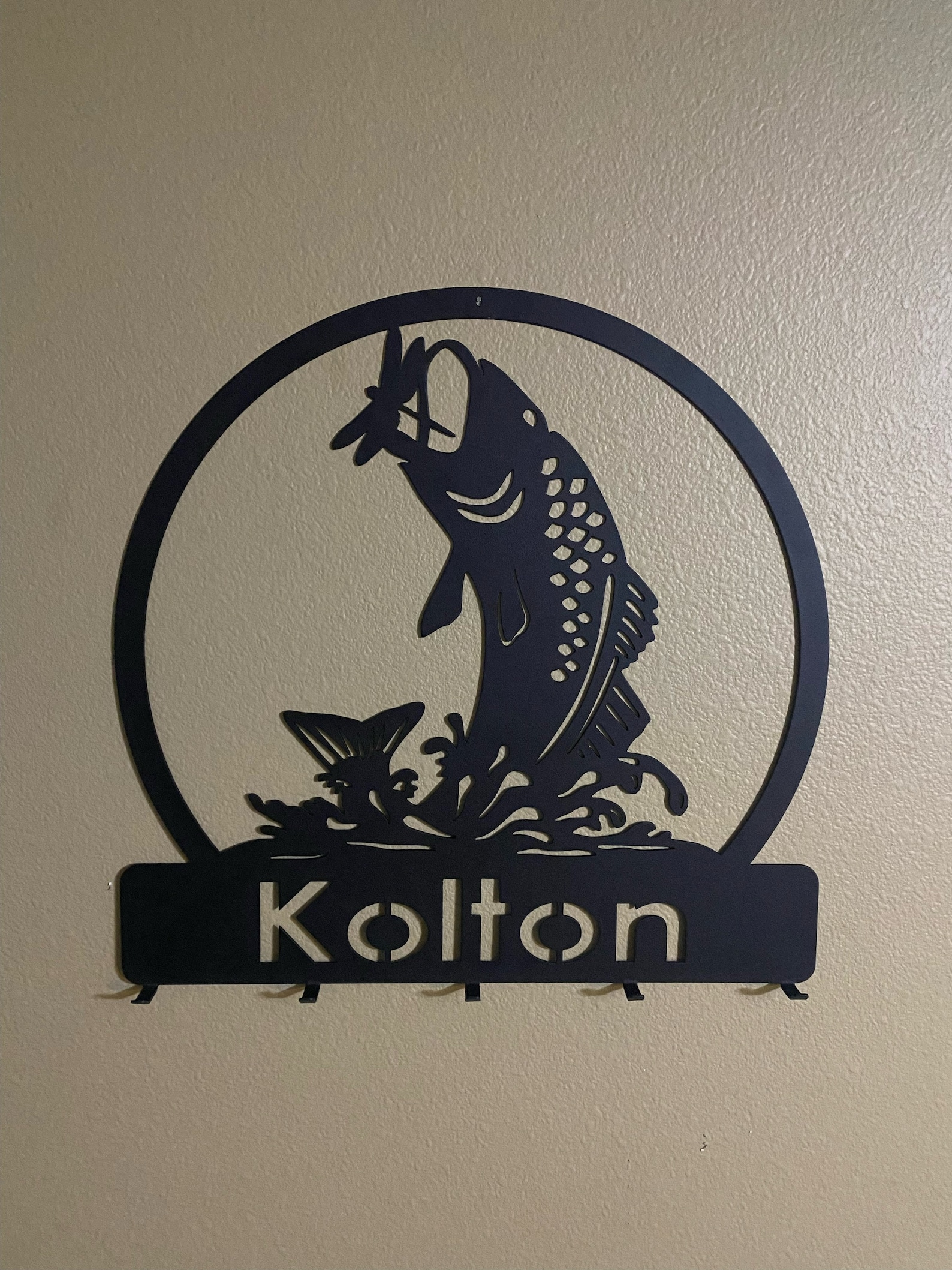 20"" fishing sign with hooks cut from 14 gauge Steel. Can be used as a coat or key hook as well!