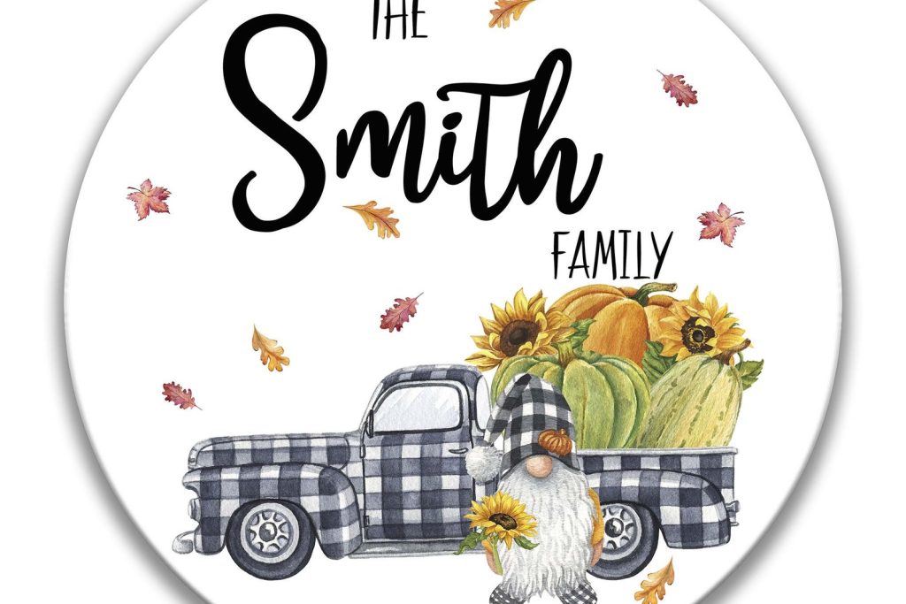 Personalized Gnome Sign, Buffalo Plaid Truck Gnome Fall Metal Sign, Round Gnome Signs, Autumn Pumpkin Patch Fall Gnome Decor Custom 7-FAL009
