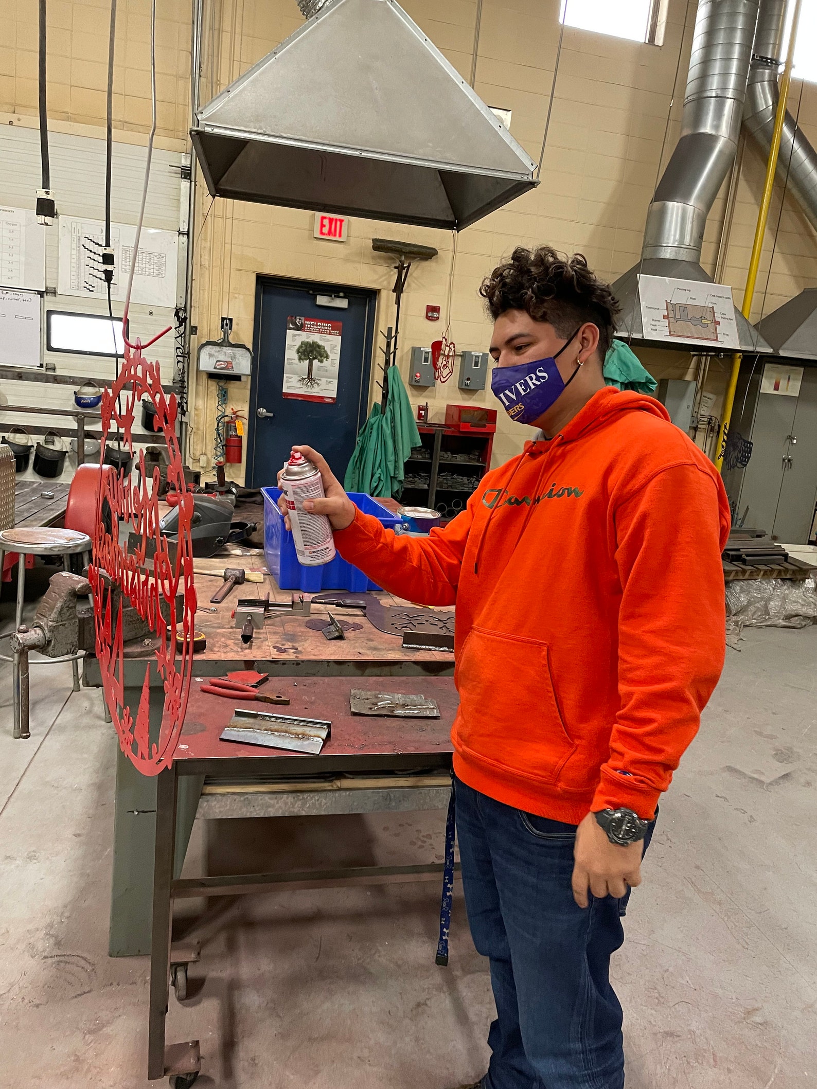 Plasma cut out of 16 gauge steel sheet metal by high school manufacturing class.