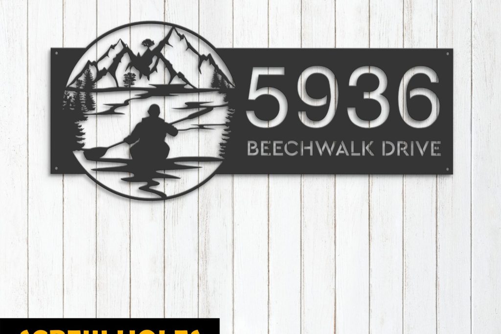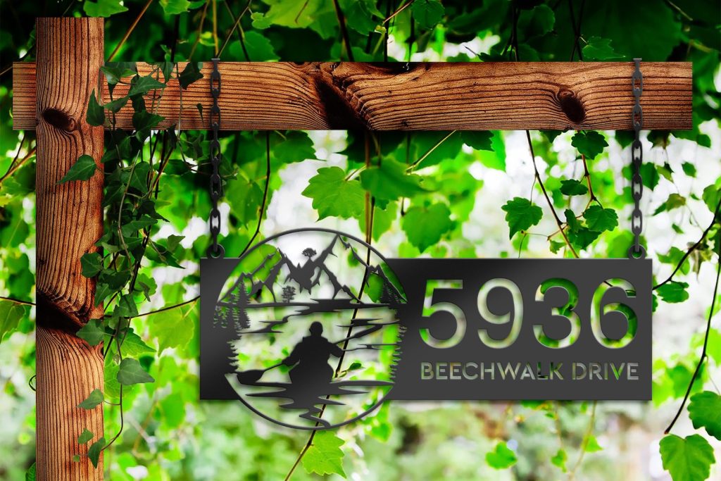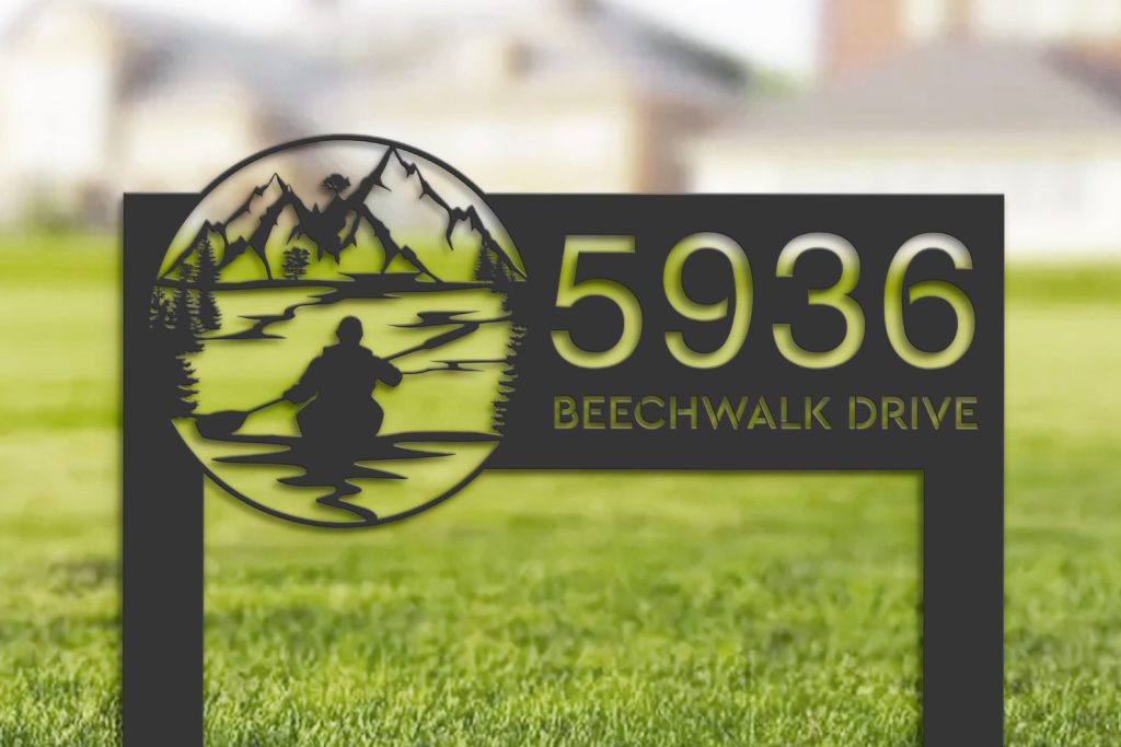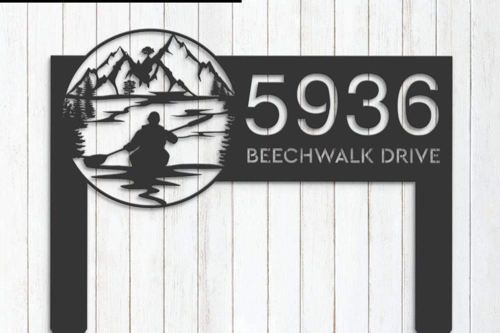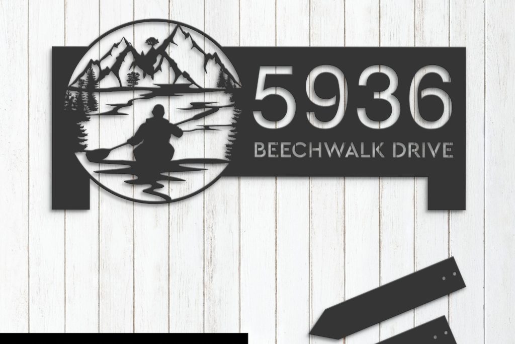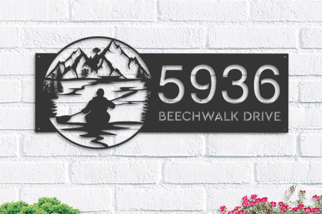 Personalized Kayaking Metal Address Sign – Lake Mountain Scene Plaque