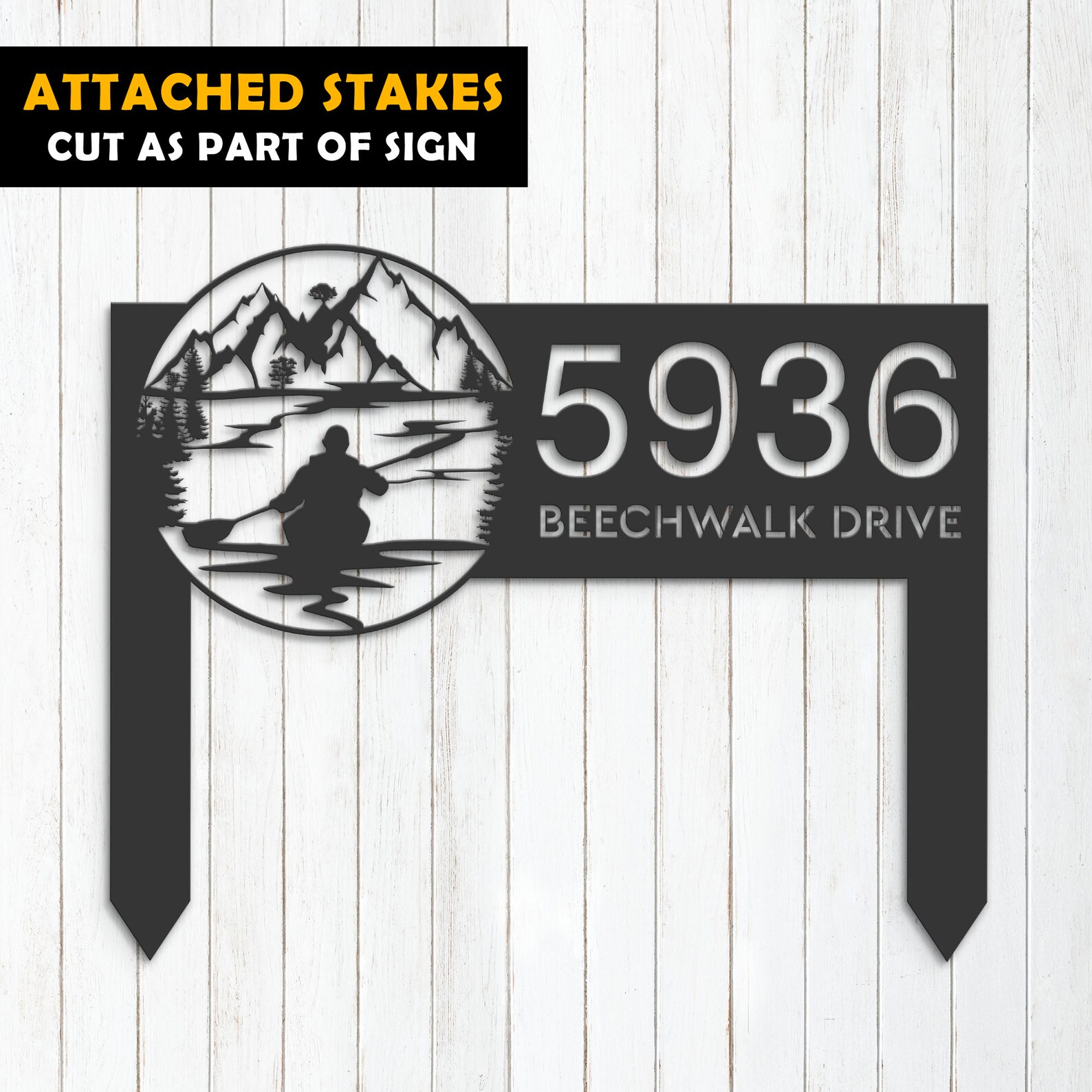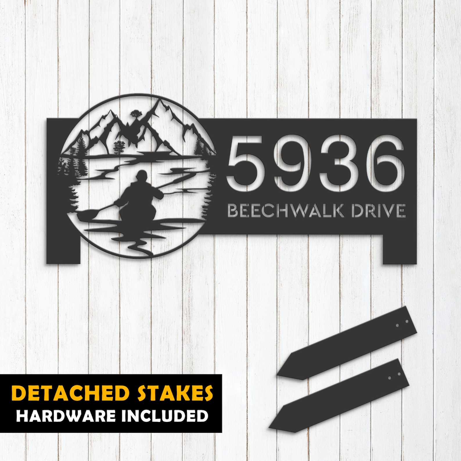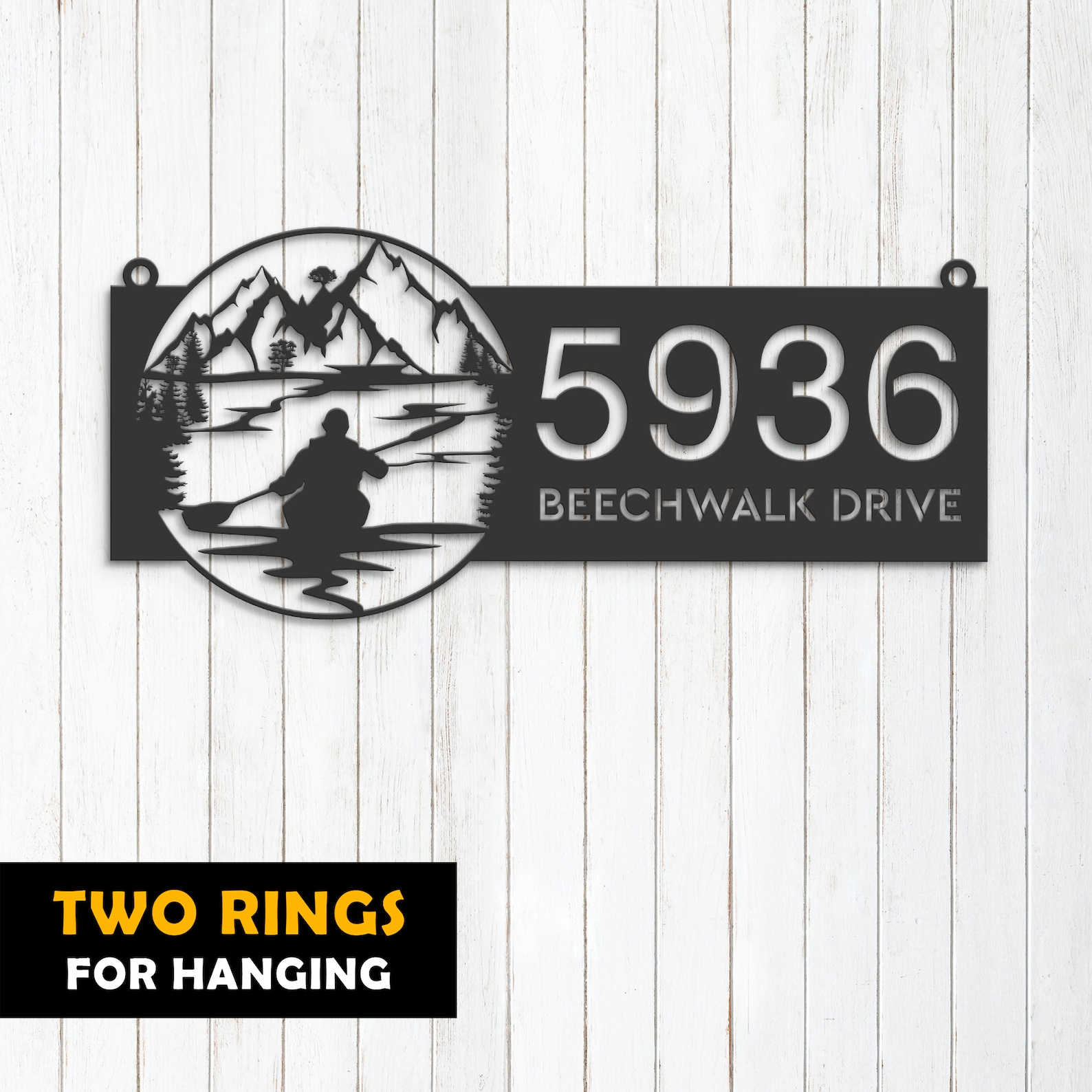 Personalized Kayaking Metal Address Sign – Lake Mountain Scene Plaque