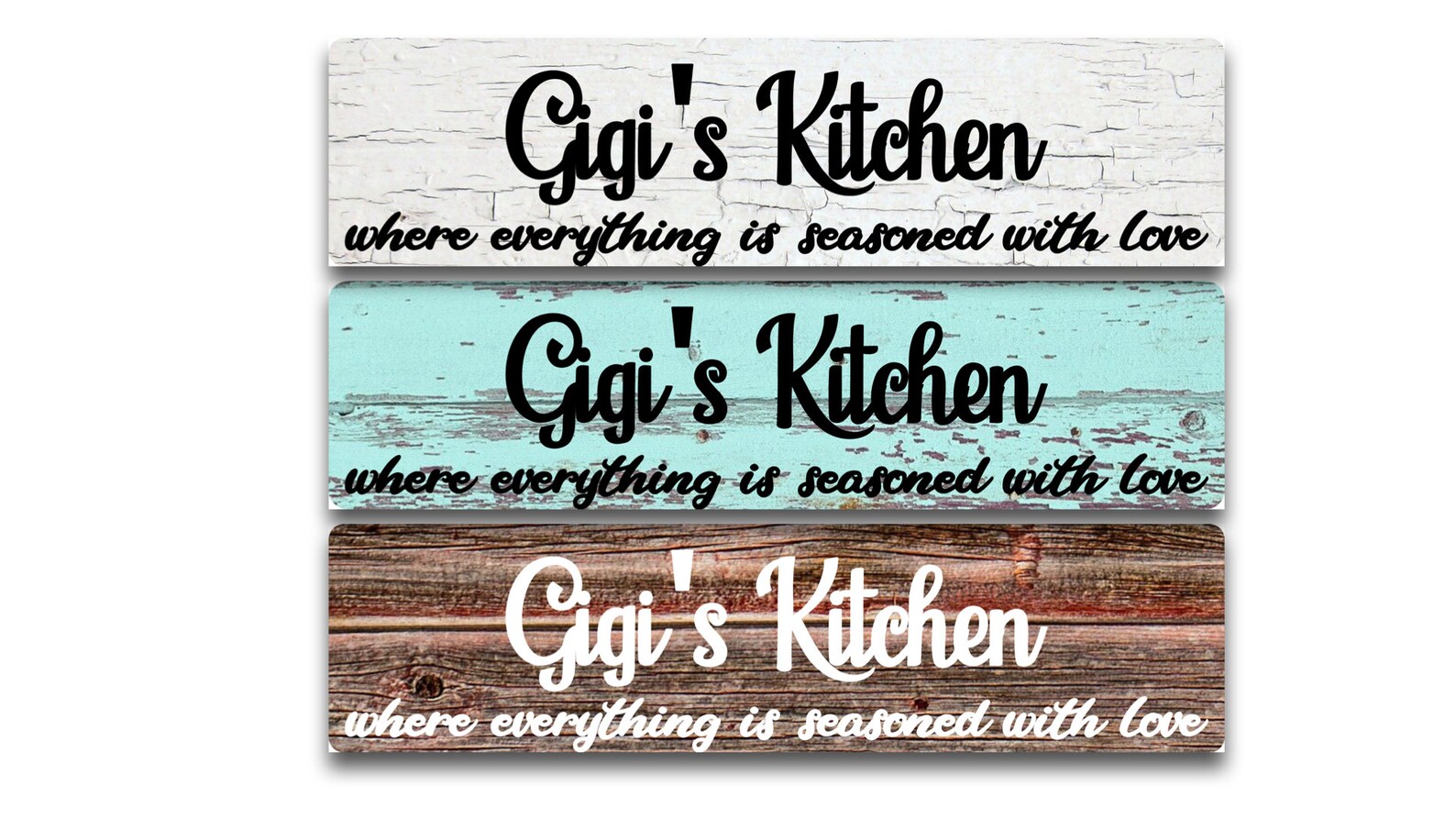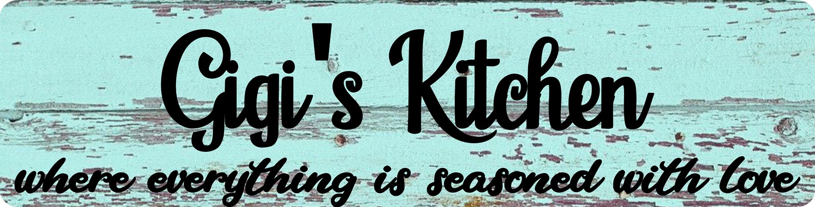Design: Kitchen where everything is seasoned with love sign. Personalize your name. Choose from White Crackle or Grey wood Metal Sign Door Plaque – (Note not actual paint or wood so smooth)