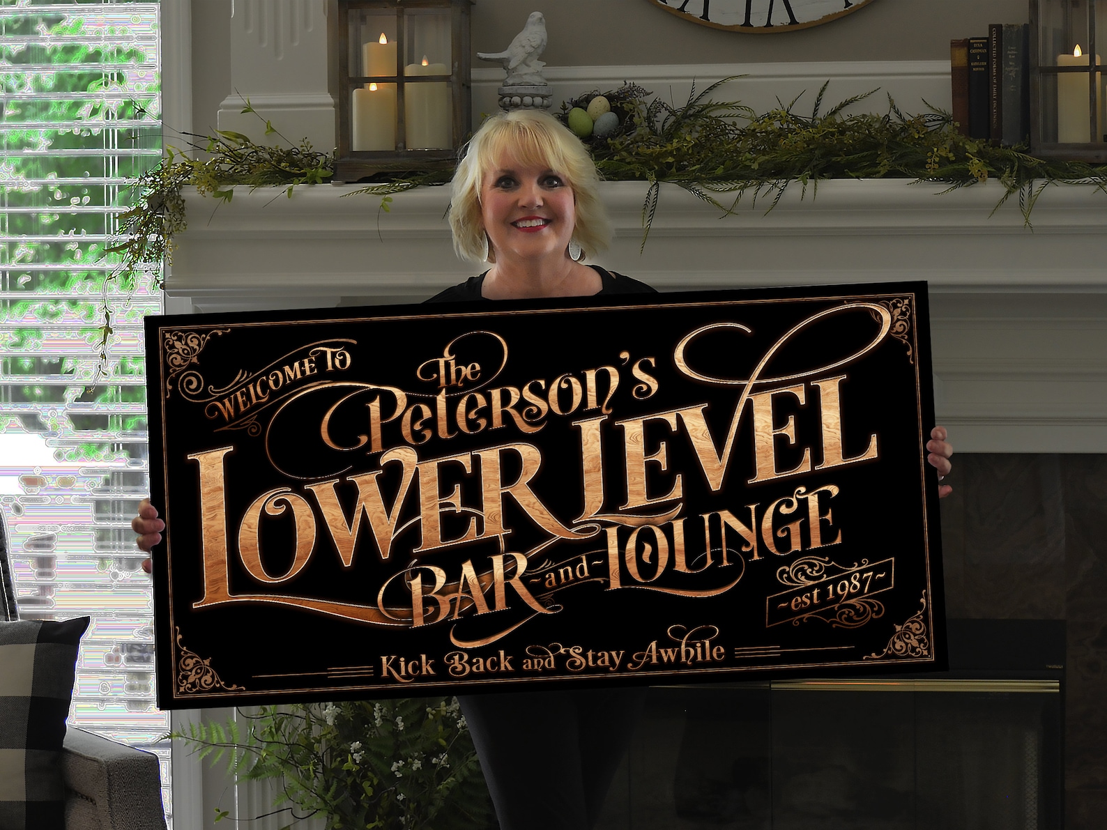 This Lower Level Bar and Lounge Family Name sign offers a modern farmhouse look and feel. I added a wood grain overlay within the fonts and graphic elements. Display this vintage, lower level, basement sign anywhere in your home or on the porch. It comes in your choice of metal or canvas!