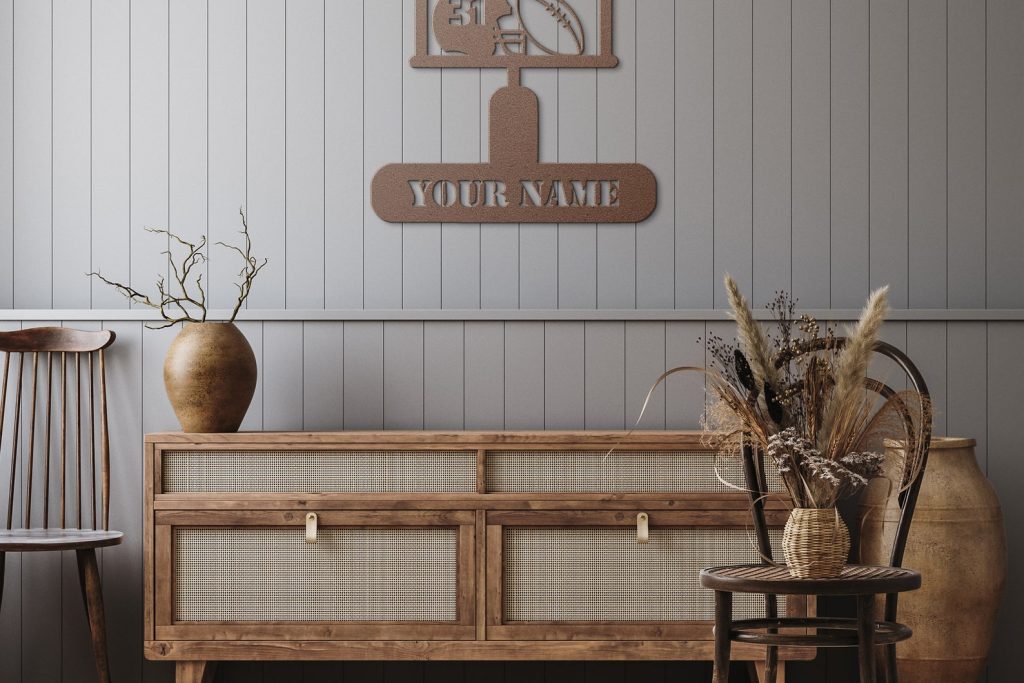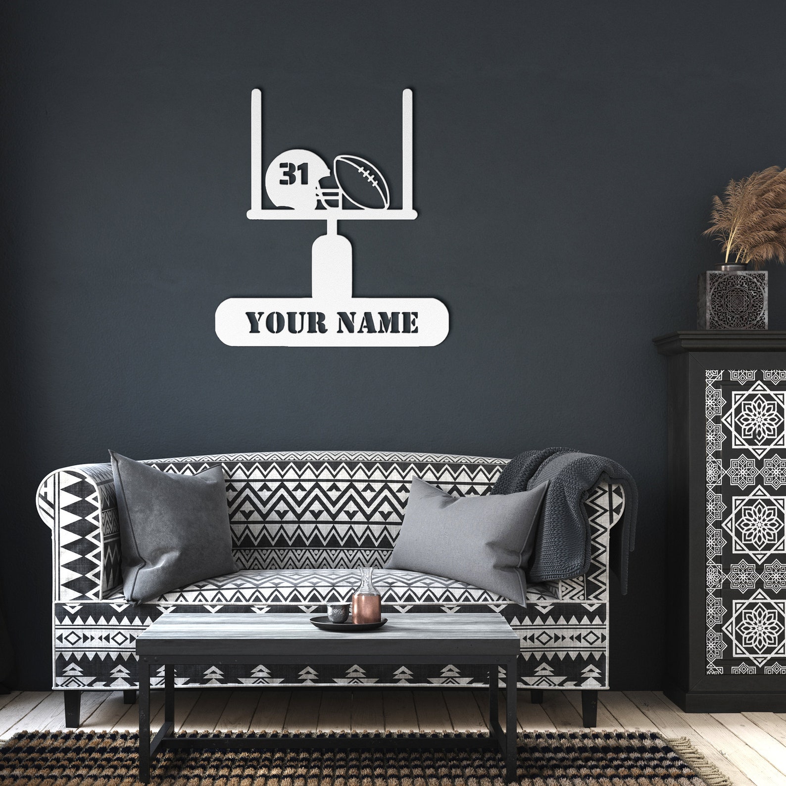 Victory on Display: Personalized Metal Football Sign. Show off your love for the game with our custom-made metal football sign. Crafted to perfection, this sign is perfect for showcasing your team spirit in any room. Personalize it with your favorite team9;s name, player9;s name, or any text you desire. A perfect addition to your football den or a thoughtful gift for any football fanatic. Score big with this unique piece of handcrafted metal art. Order yours today and let the world know where your heart lies on the gridiron!