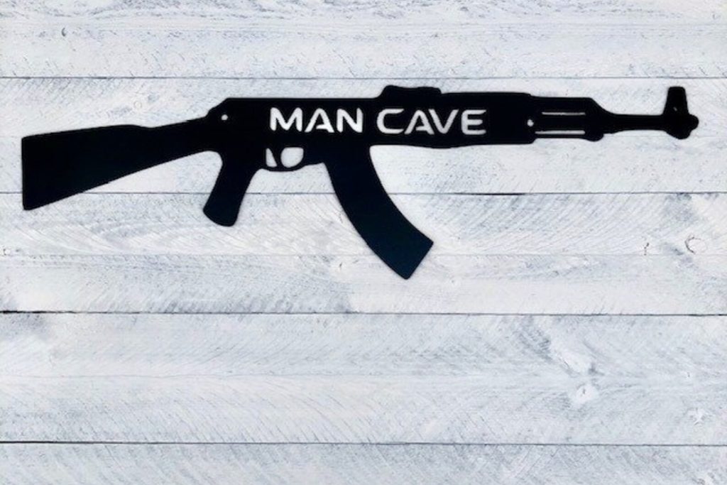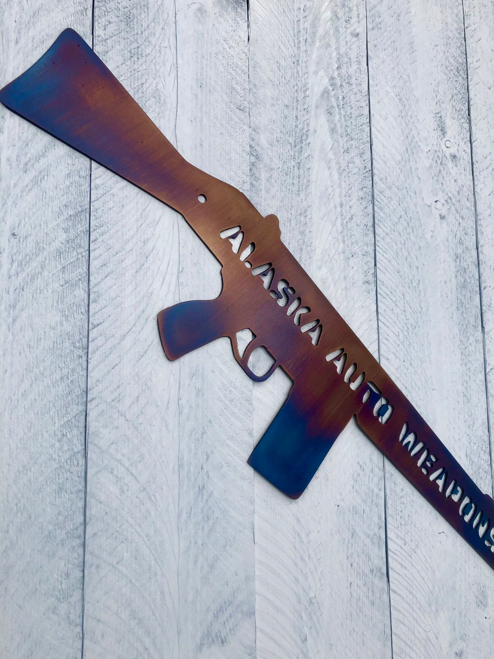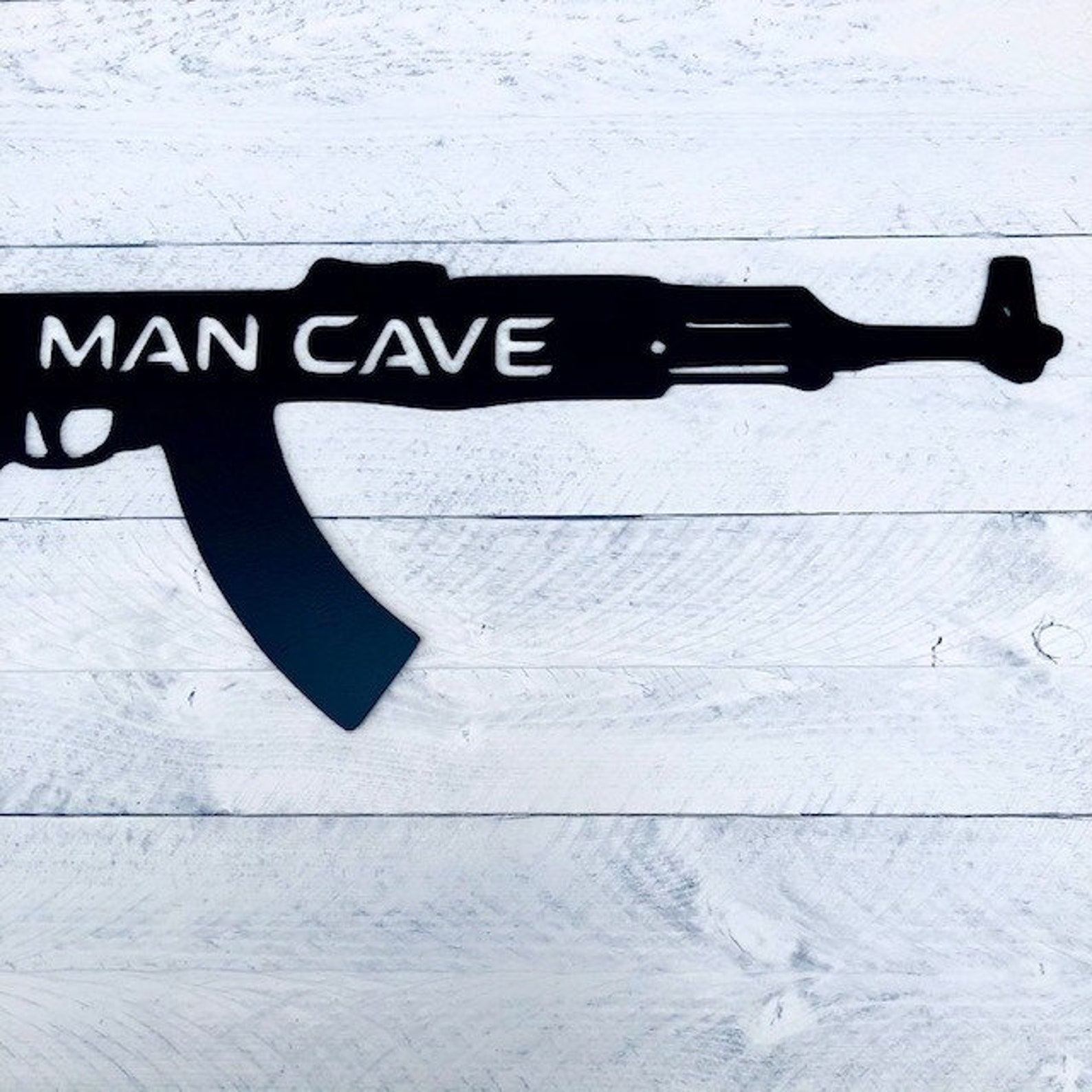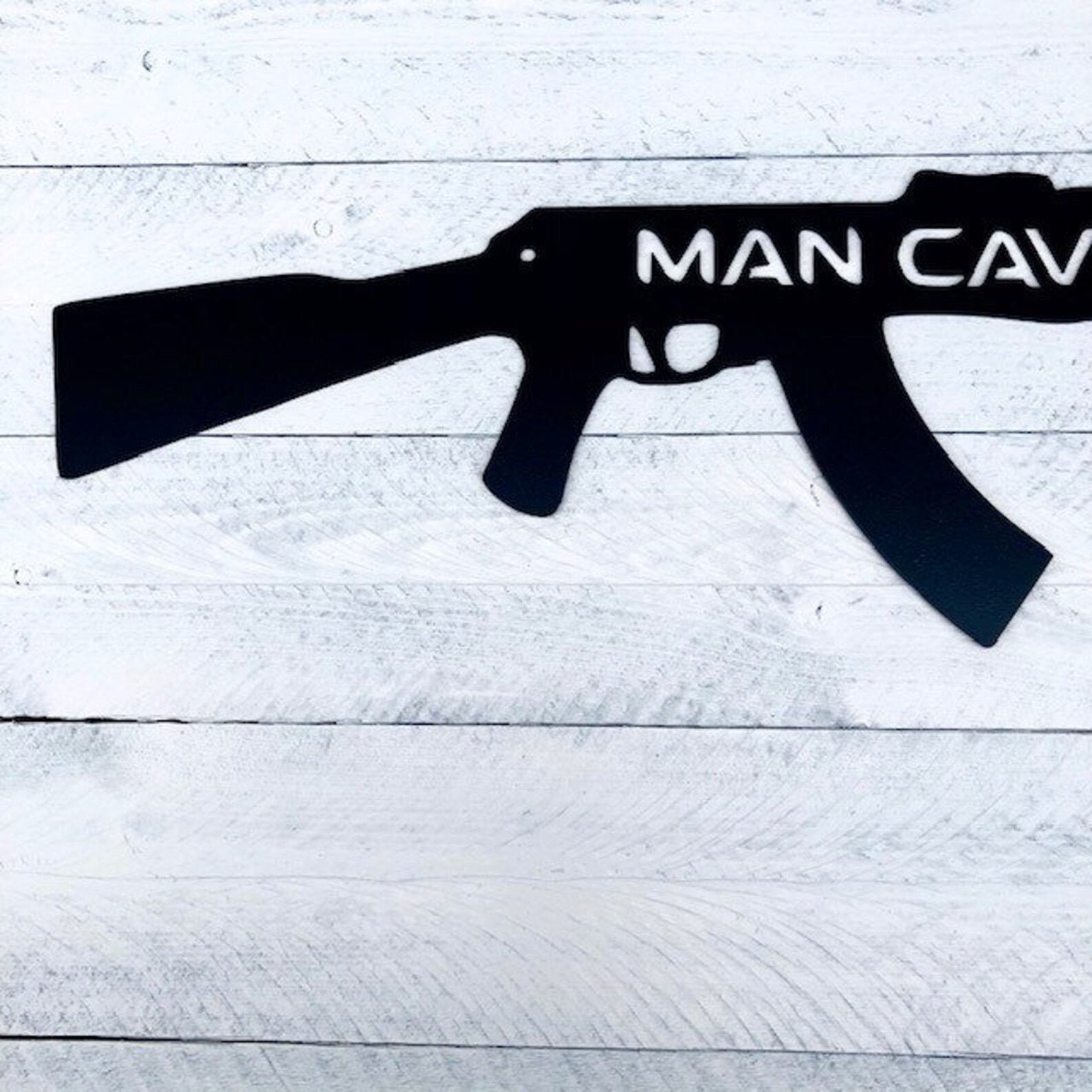 The perfect Father9;s Day gift for the gun enthusiast in your life. An AK-47 cut from 16 gauge steel to hang on the door of HIS (or her) space. Custom words also available. Send a message upon purchase with personalization if desired. Painted black unless otherwise requested.