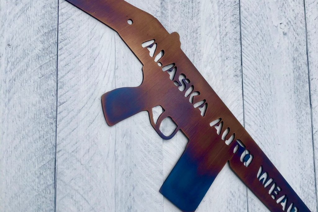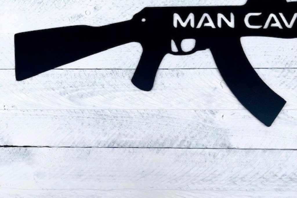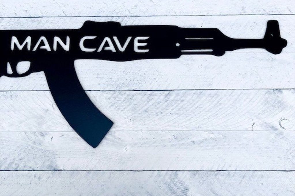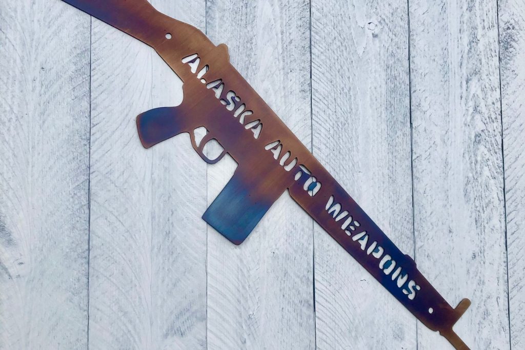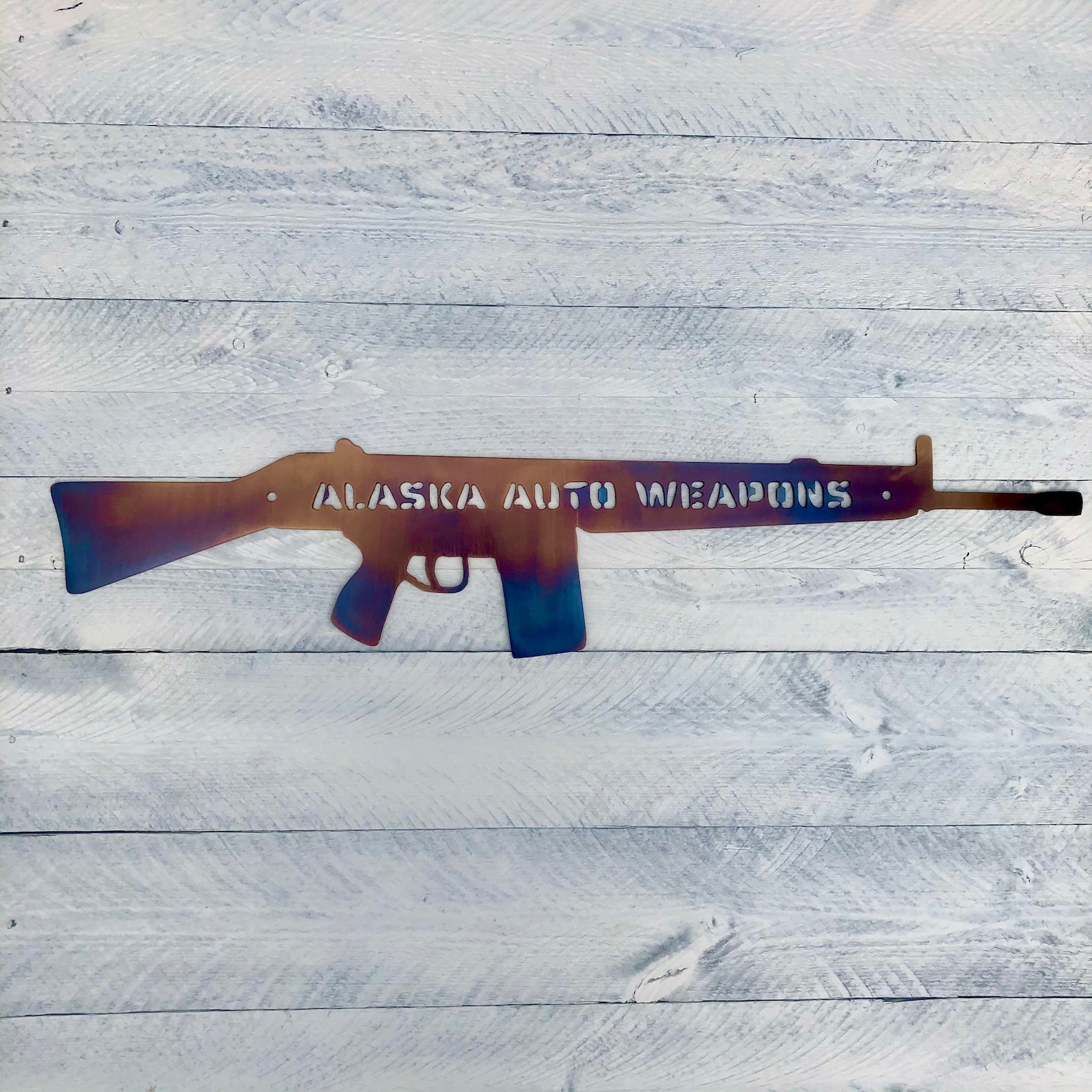 The perfect Father9;s Day gift for the gun enthusiast in your life. An AK-47 cut from 16 gauge steel to hang on the door of HIS (or her) space. Custom words also available. Send a message upon purchase with personalization if desired. Painted black unless otherwise requested.