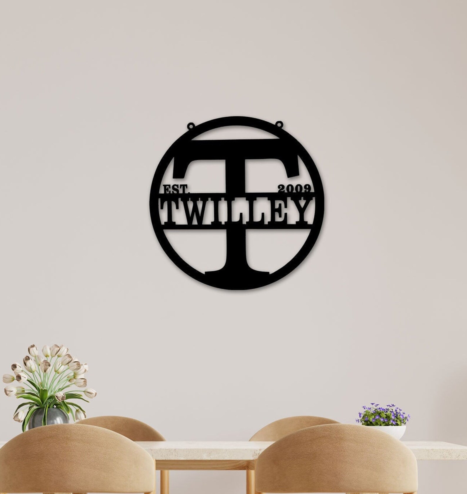 We provide a laser cut personalized sign that gets powder coated. This design has holes in it for mounting, we do not provides screws or anything to hang the sign with due to peoples different preferences. Feel free to message me with any advice on hanging the sign.